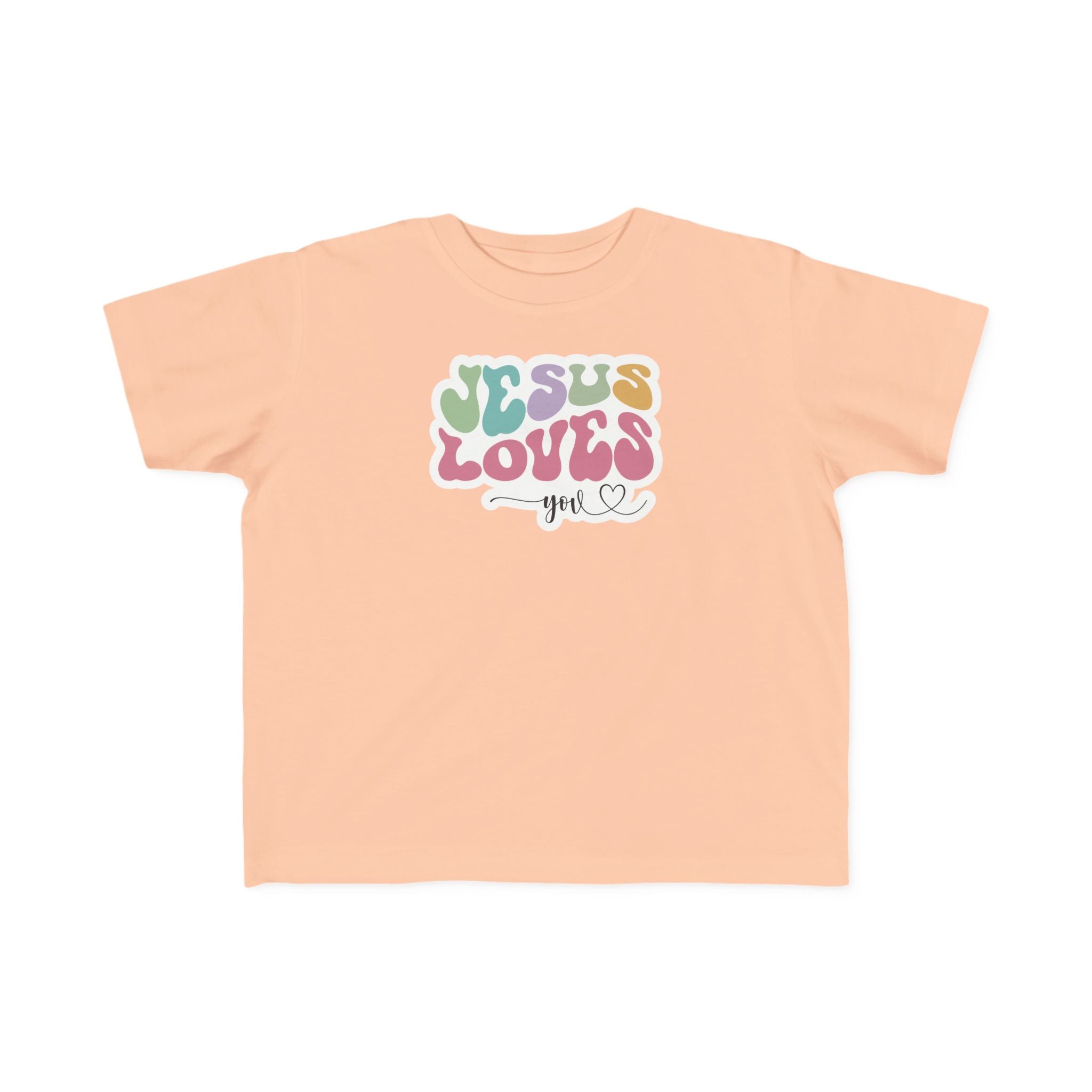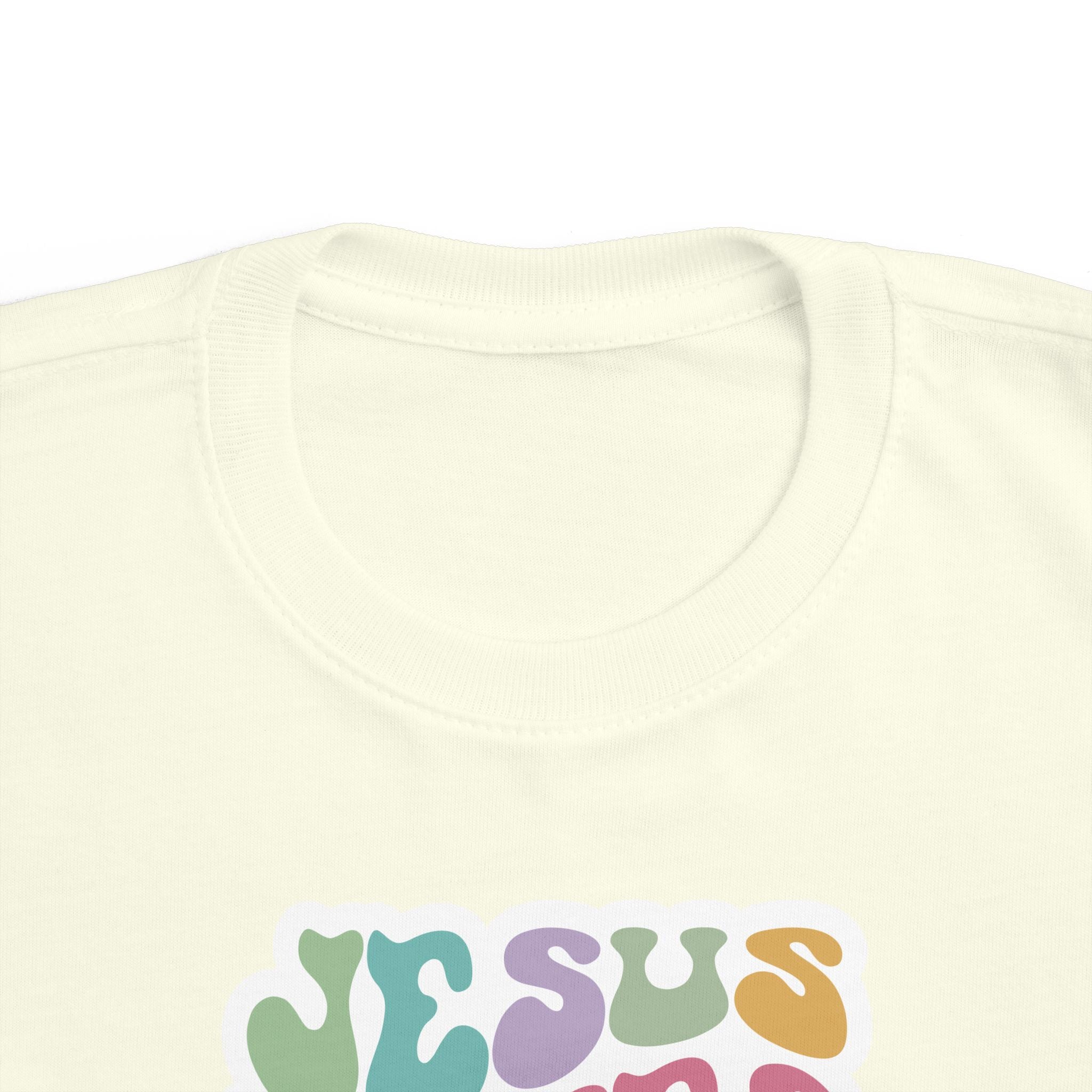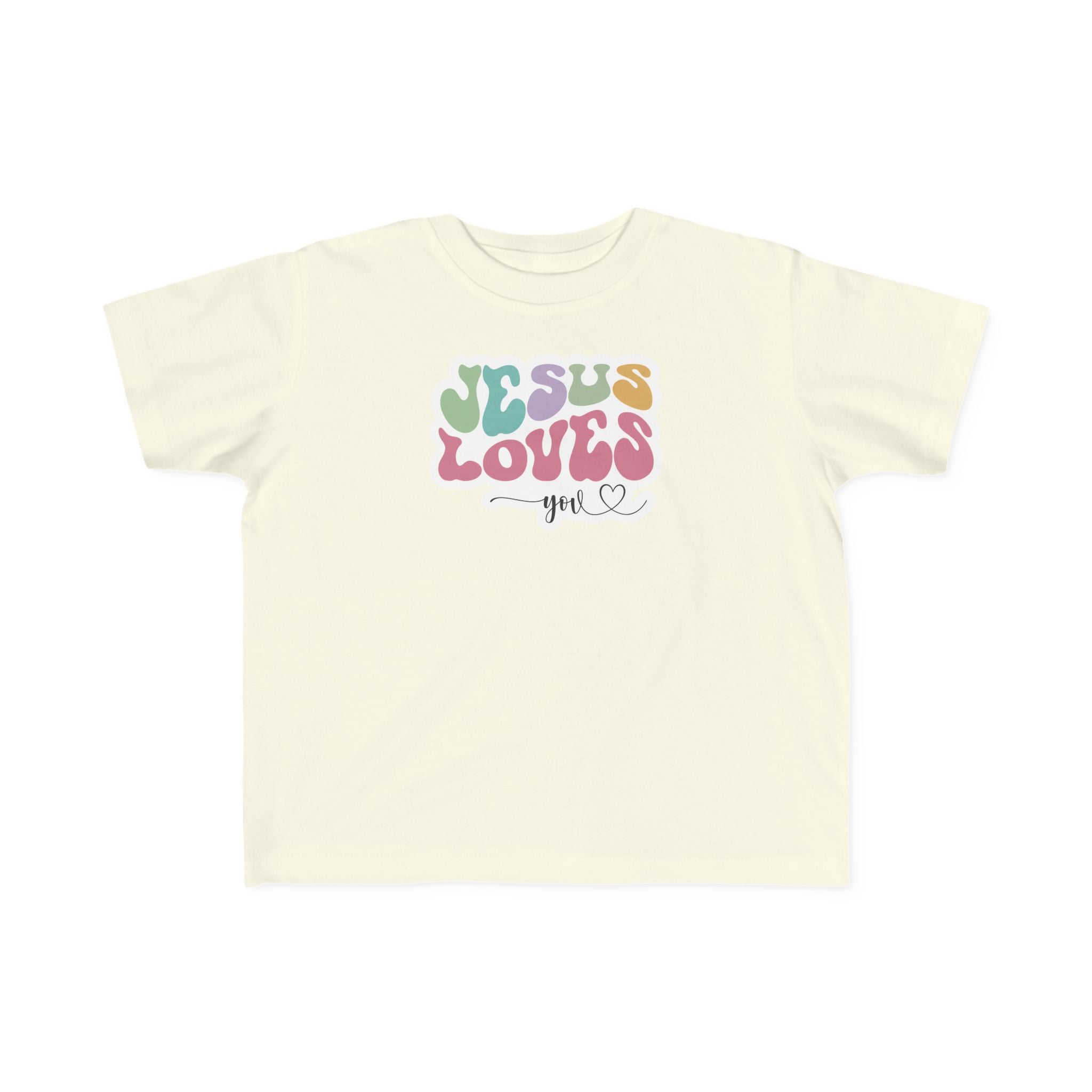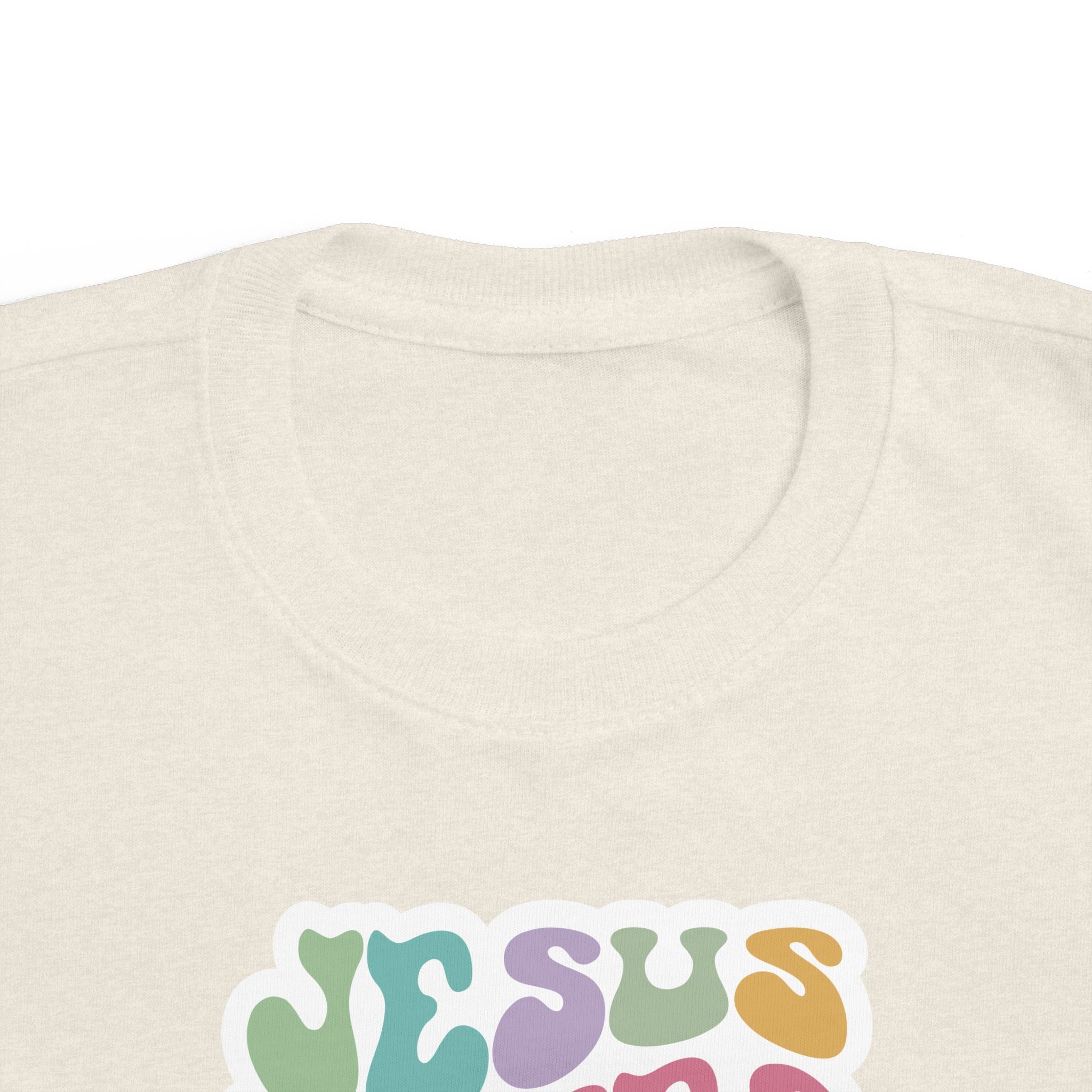 Soft, lightweight toddler tee with a joyful, hand-lettered design that reads “Jesus Loves You” in playful, retro-inspired colors. The shirt feels breathable against delicate skin and holds its shape through play thanks to side seams and shoulder tape. The ribbed collar stretches with gentle movement and keeps its form. Subtle tear-away label and DTF inner neck print make it comfortable for sensitive necks. A simple, uplifting piece that layers easily or stands out on its own during family mornings, church gatherings, or backyard playdates.