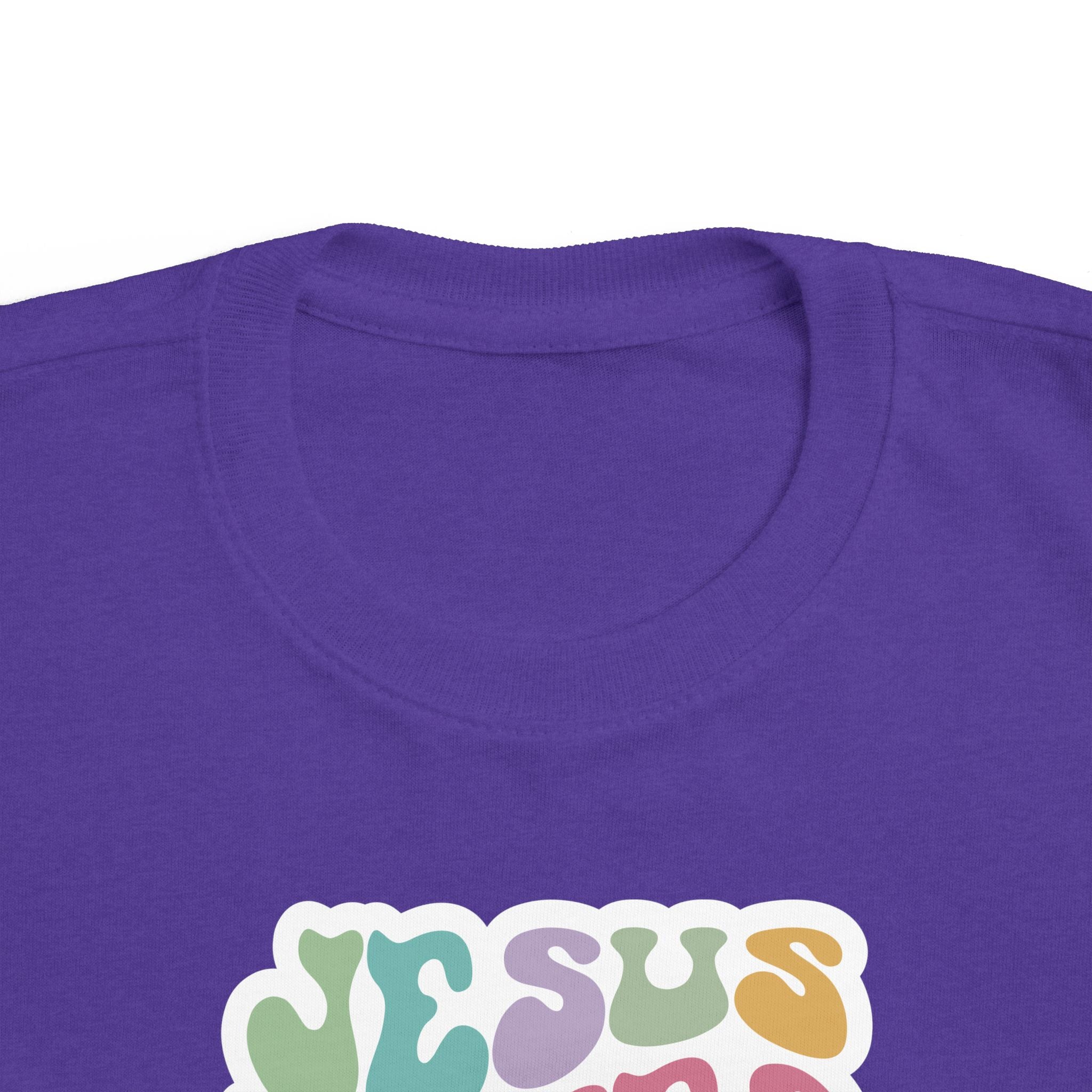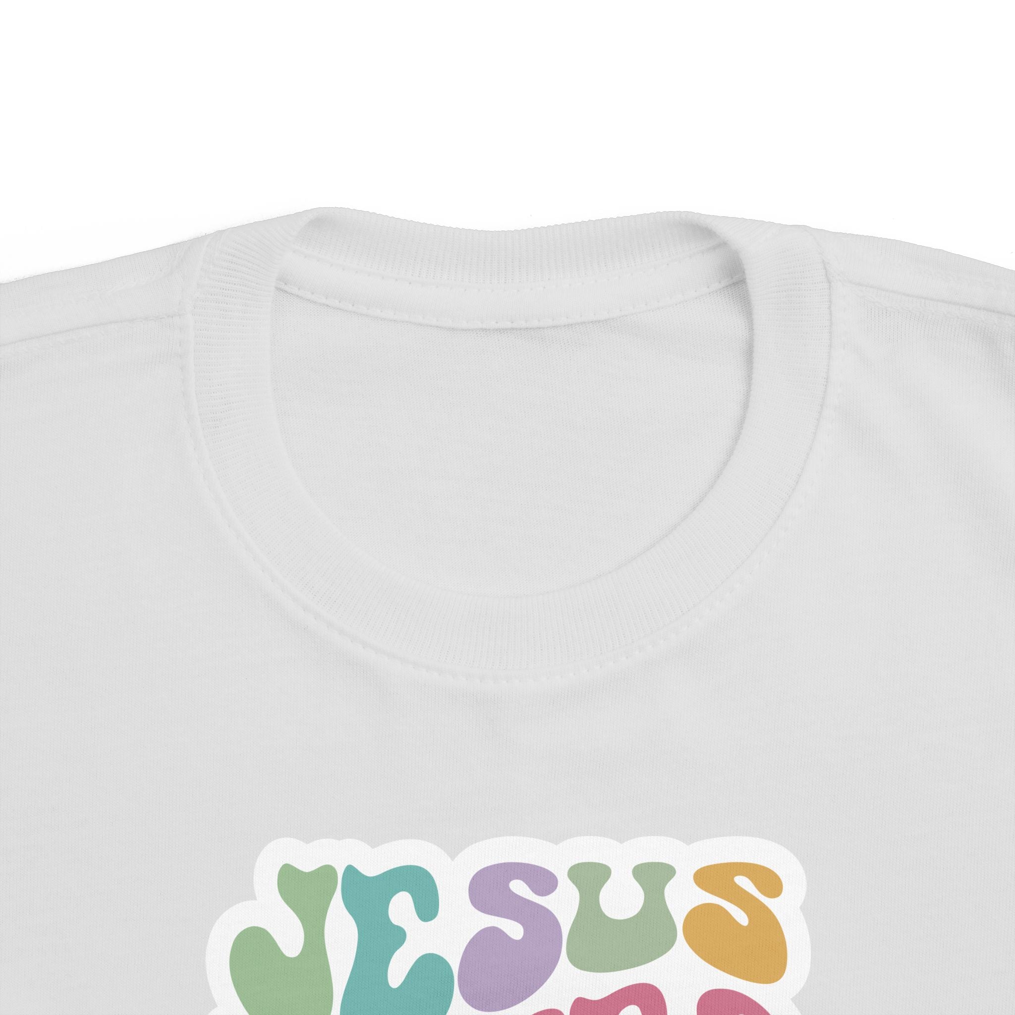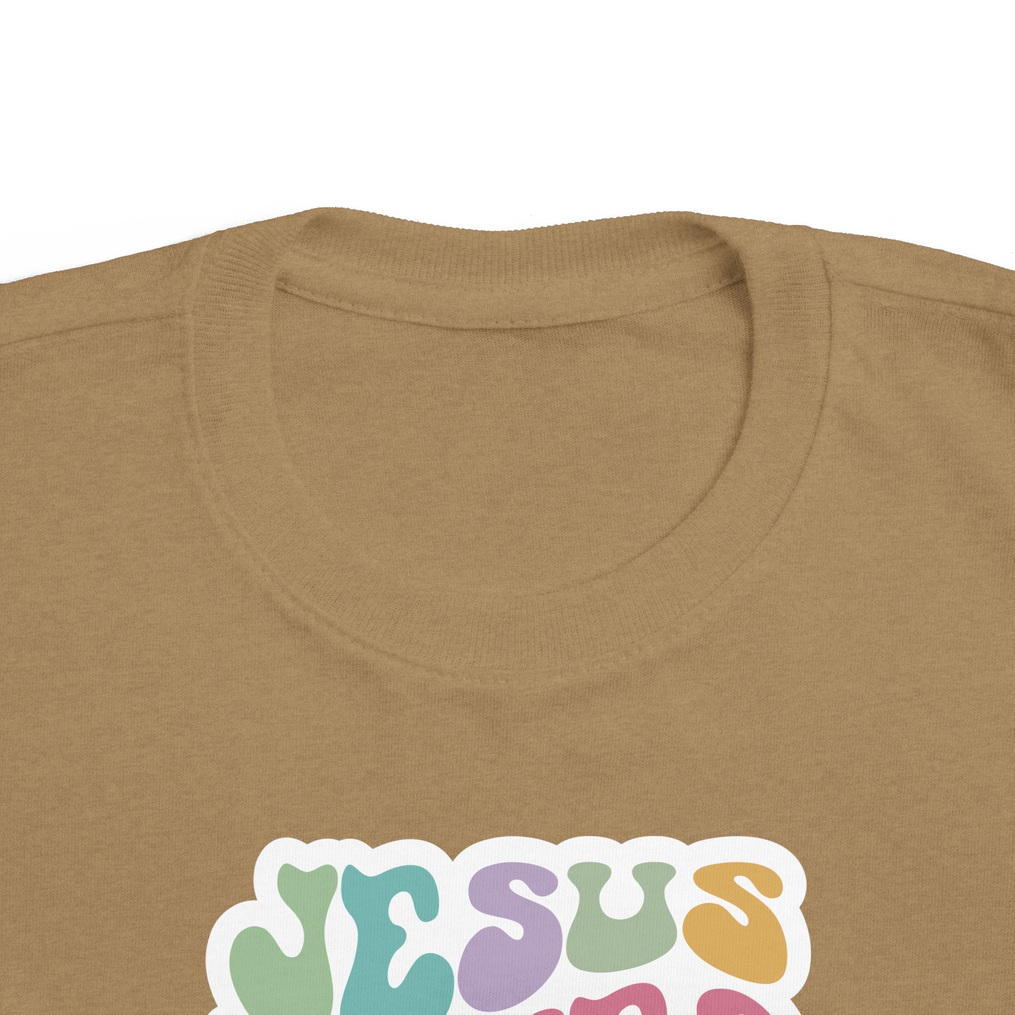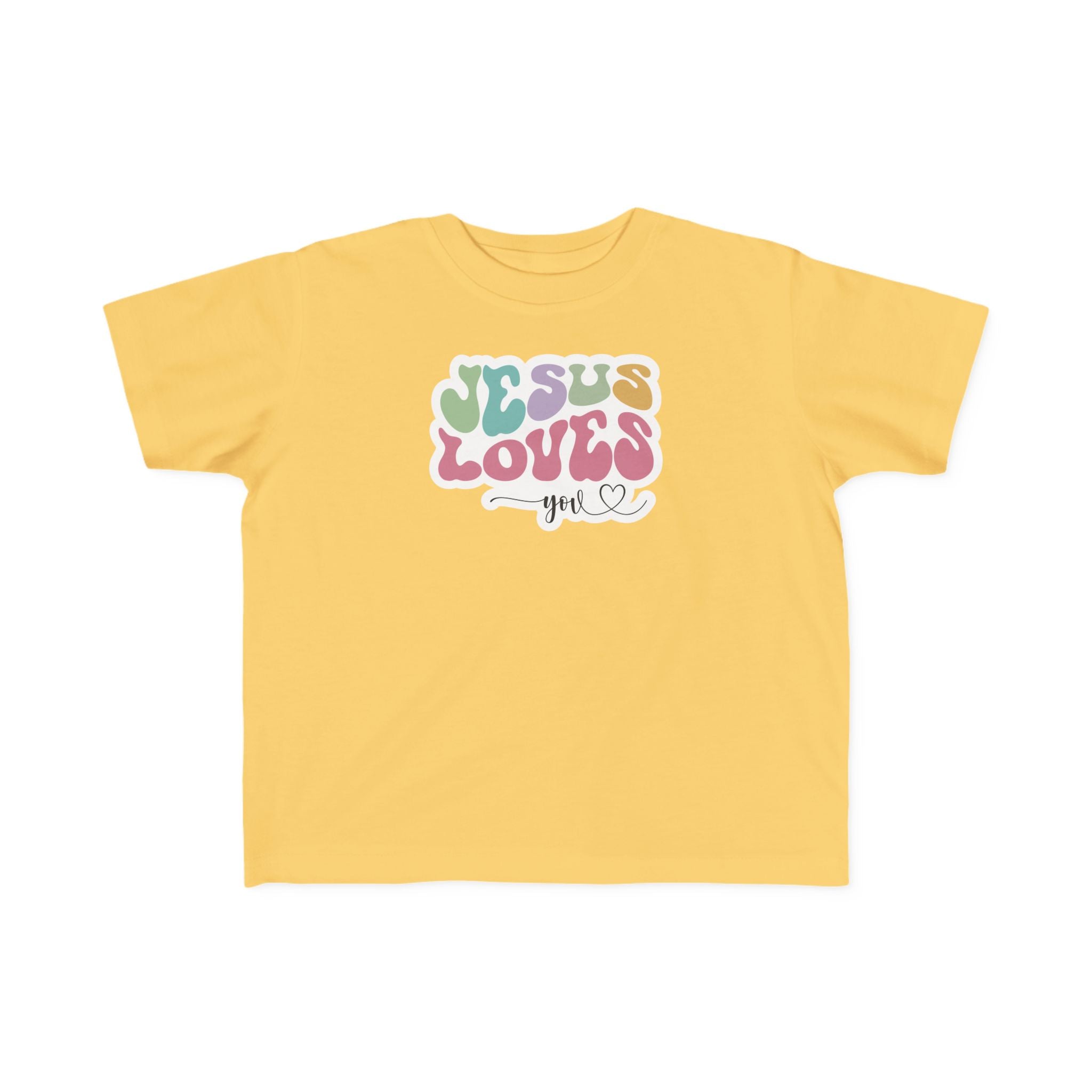 Soft, lightweight toddler tee with a joyful, hand-lettered design that reads “Jesus Loves You” in playful, retro-inspired colors. The shirt feels breathable against delicate skin and holds its shape through play thanks to side seams and shoulder tape. The ribbed collar stretches with gentle movement and keeps its form. Subtle tear-away label and DTF inner neck print make it comfortable for sensitive necks. A simple, uplifting piece that layers easily or stands out on its own during family mornings, church gatherings, or backyard playdates.
