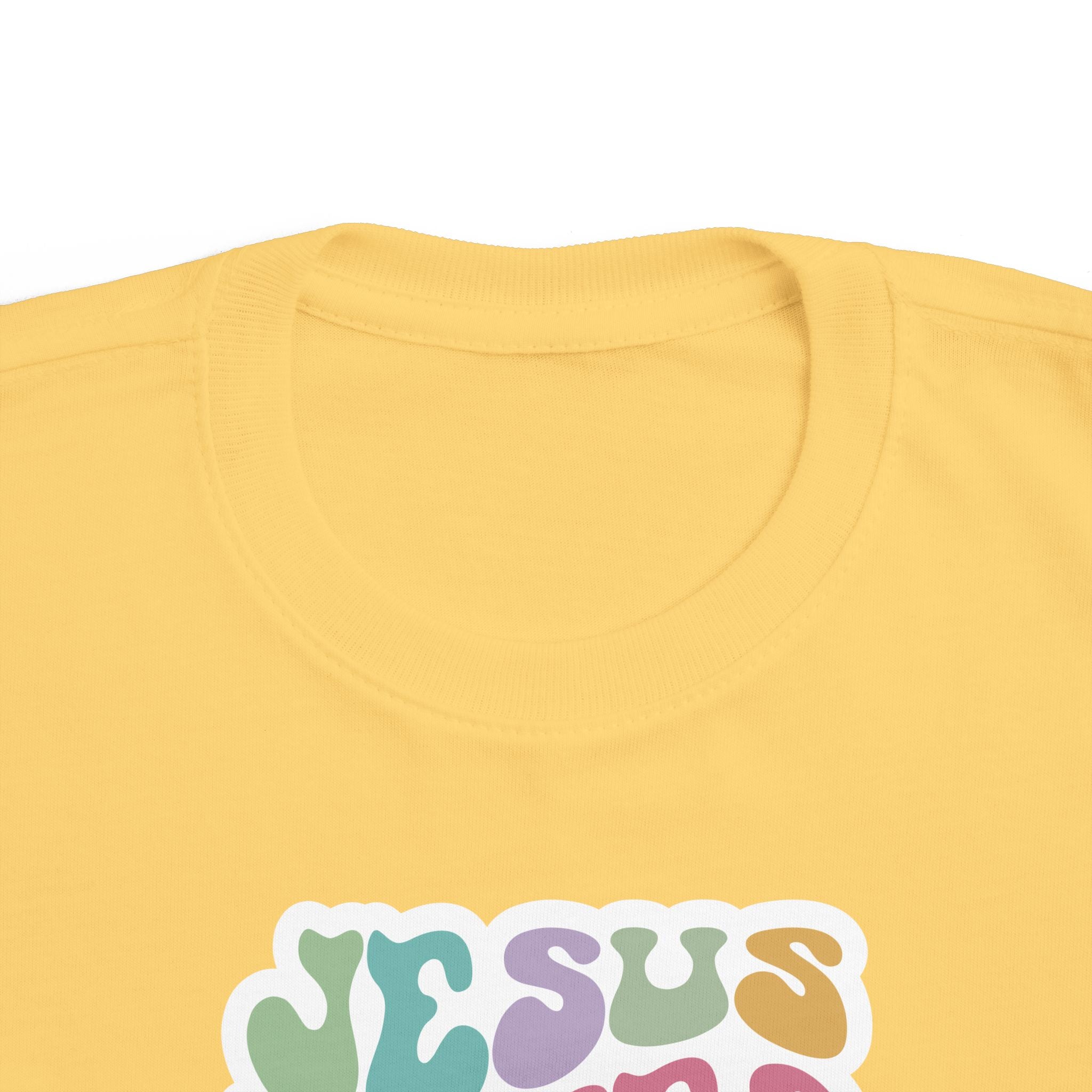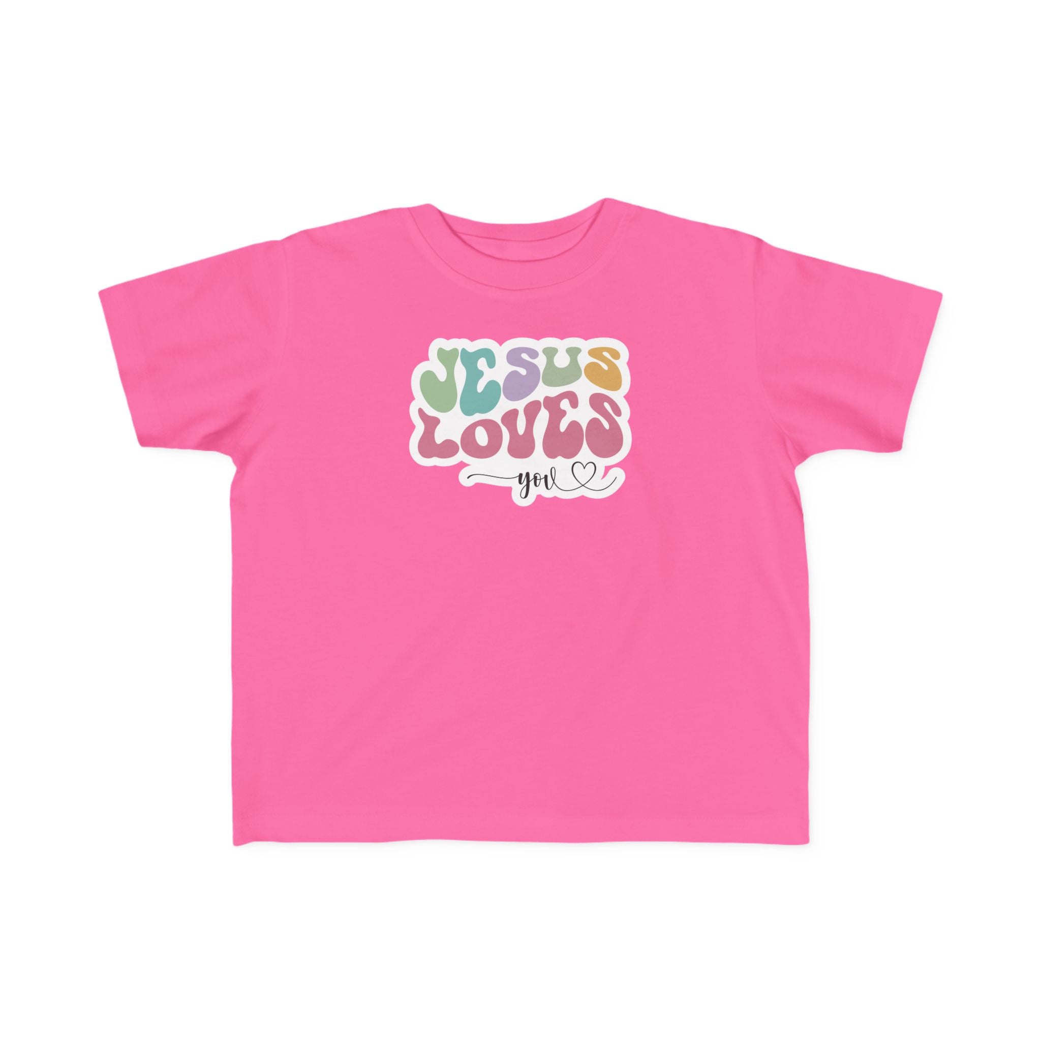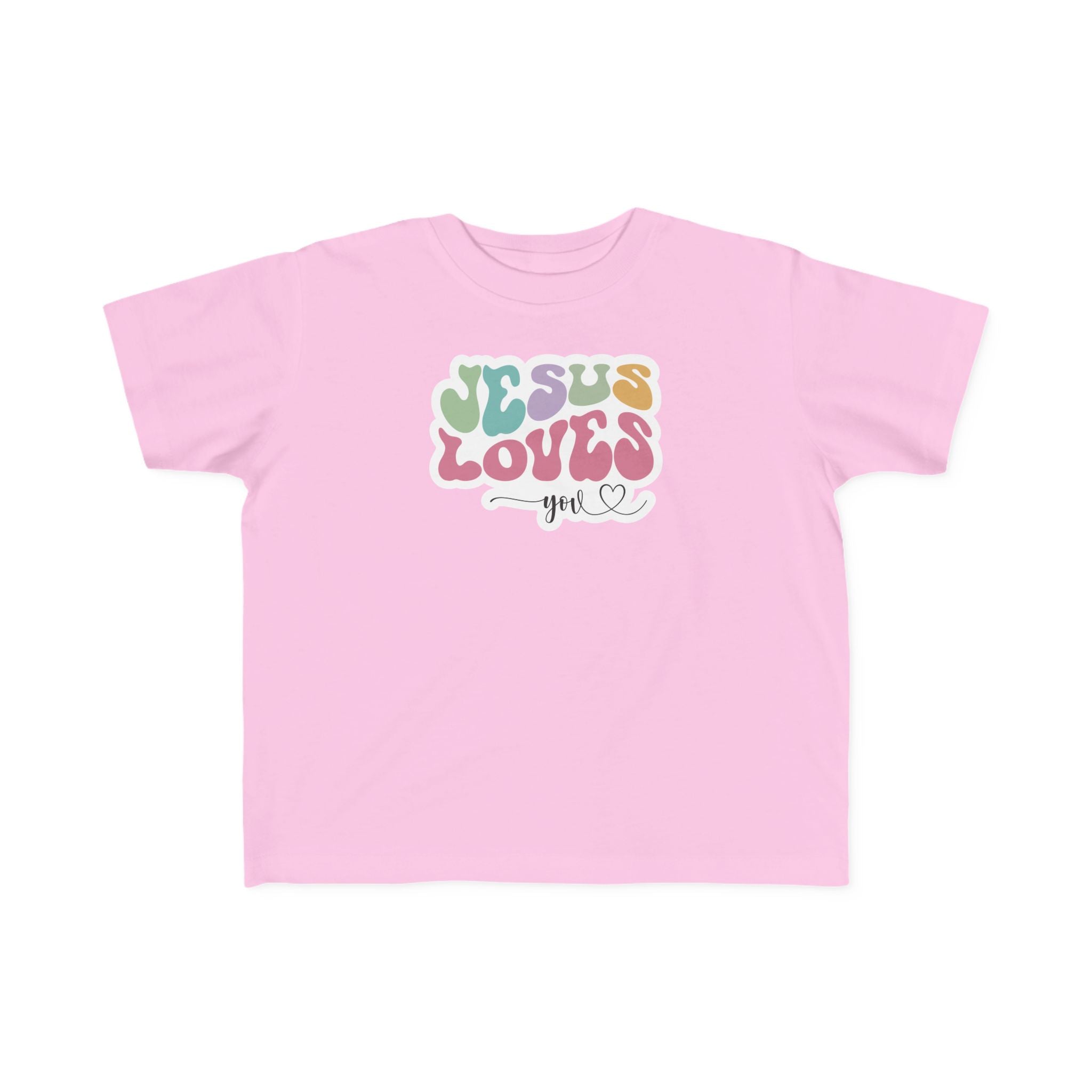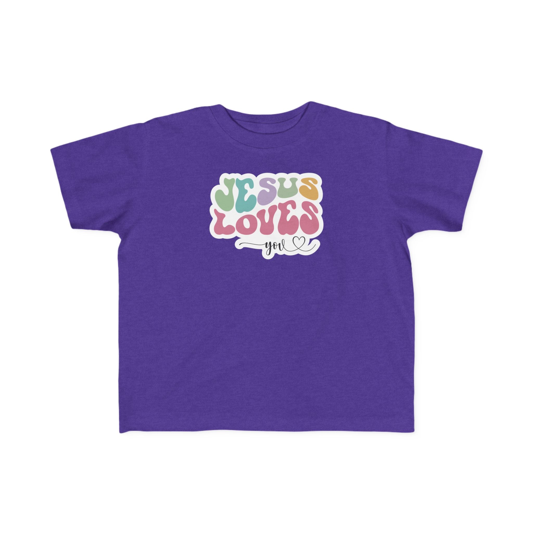 Soft, lightweight toddler tee with a joyful, hand-lettered design that reads “Jesus Loves You” in playful, retro-inspired colors. The shirt feels breathable against delicate skin and holds its shape through play thanks to side seams and shoulder tape. The ribbed collar stretches with gentle movement and keeps its form. Subtle tear-away label and DTF inner neck print make it comfortable for sensitive necks. A simple, uplifting piece that layers easily or stands out on its own during family mornings, church gatherings, or backyard playdates.