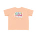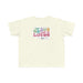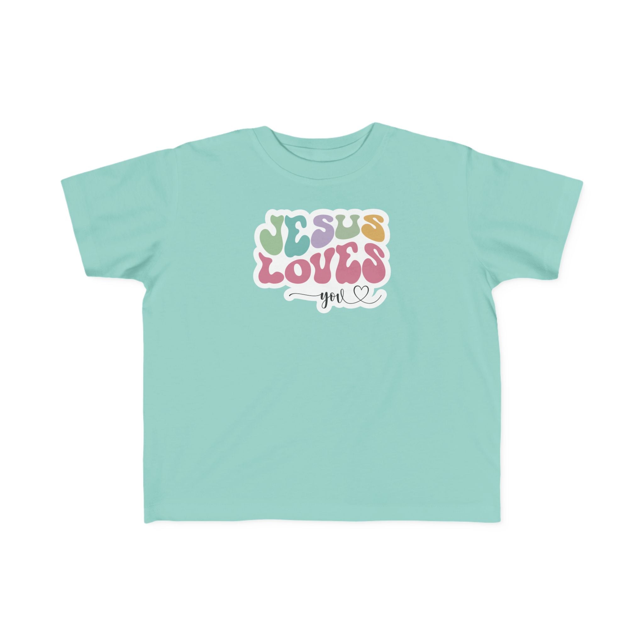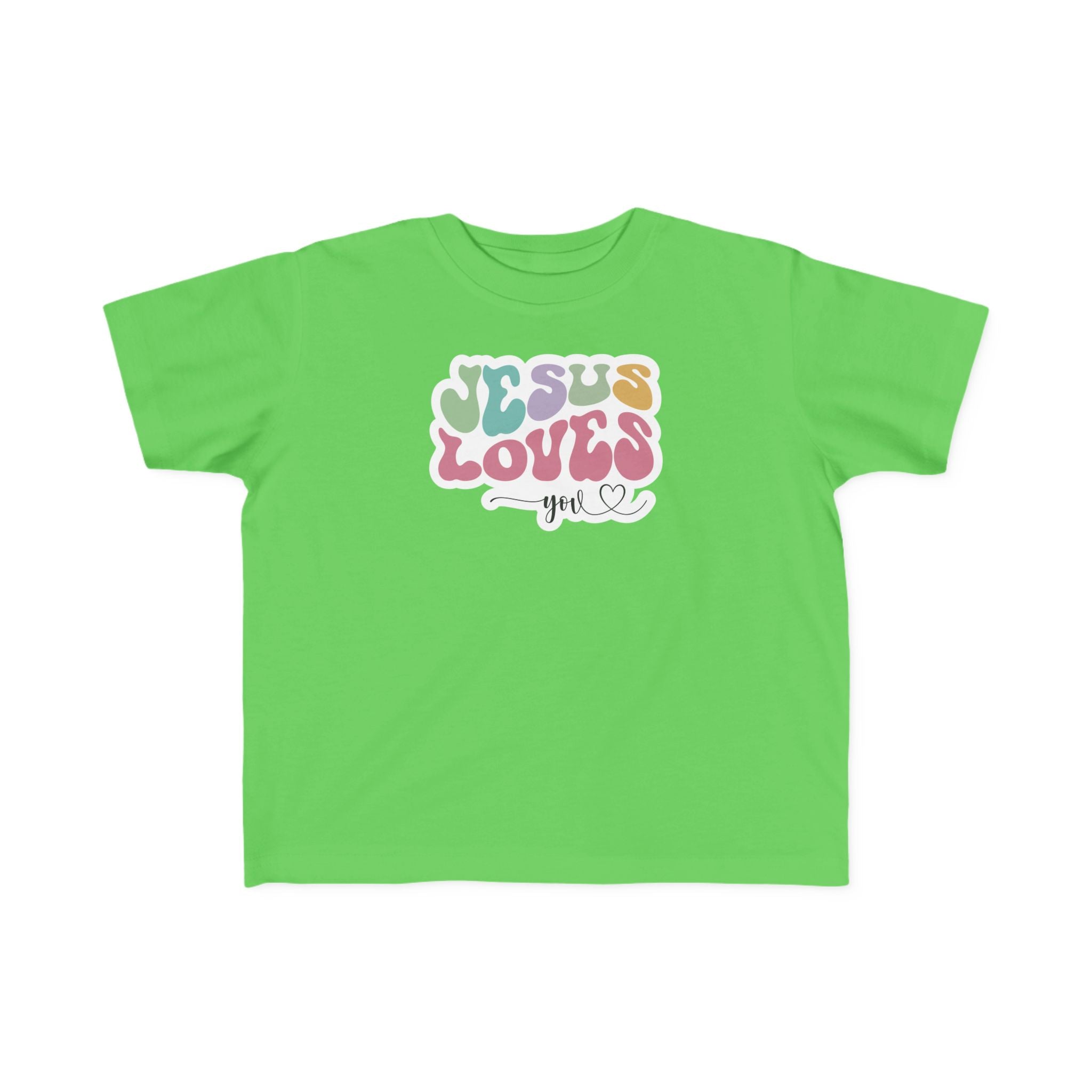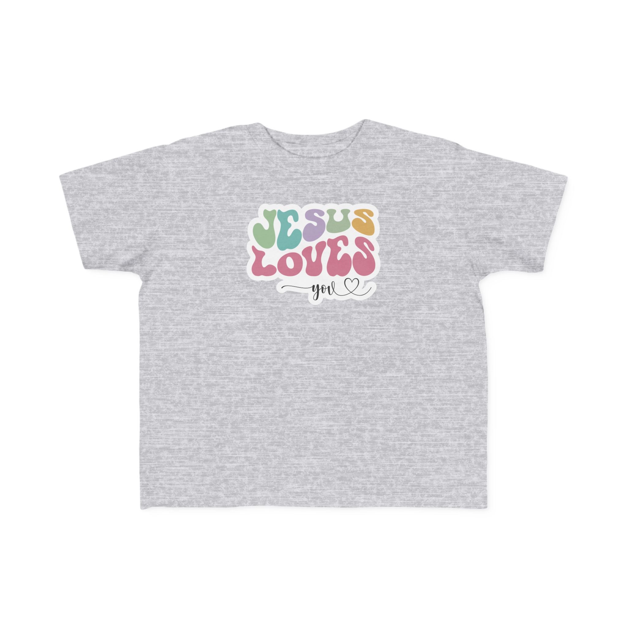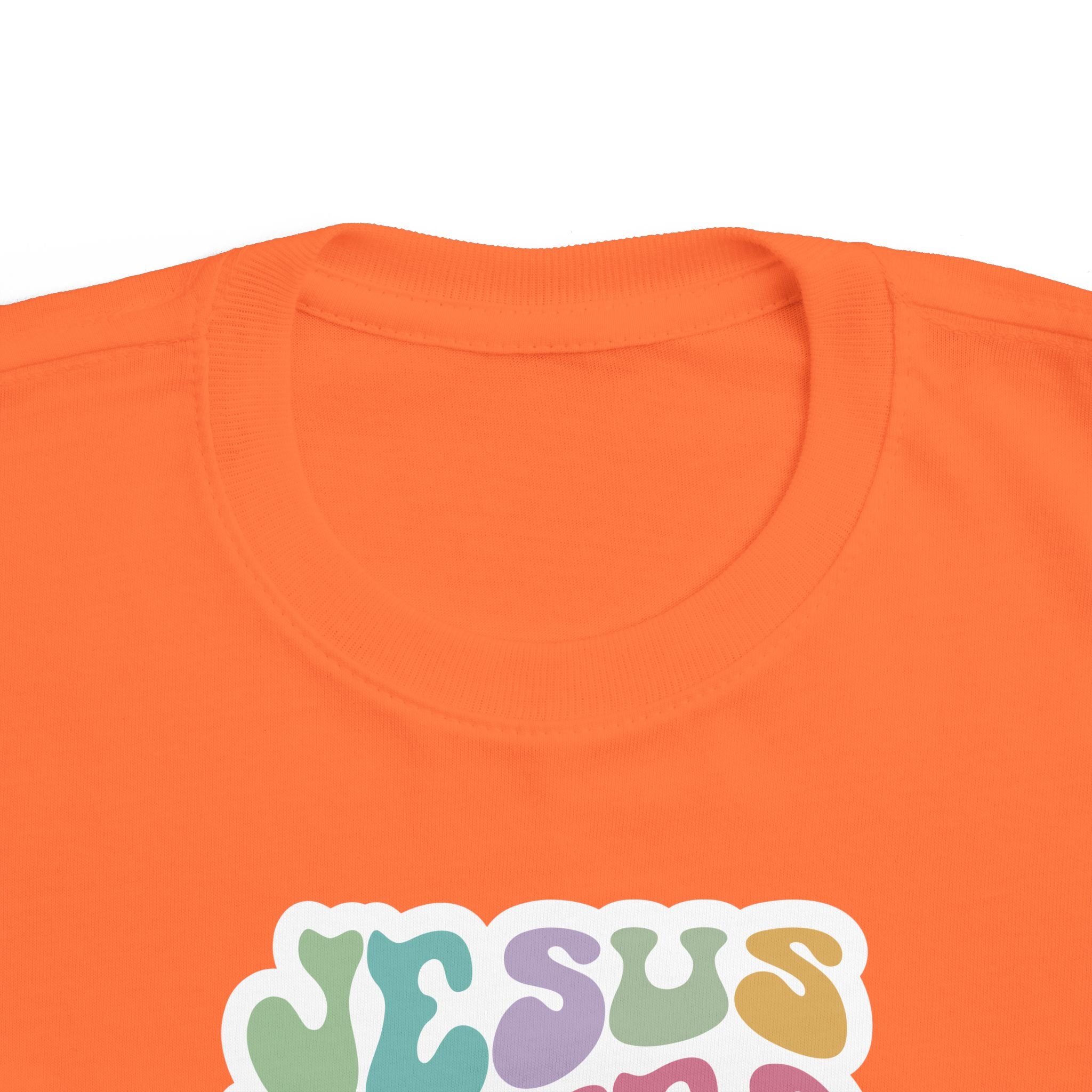 Soft, lightweight toddler tee with a joyful, hand-lettered design that reads “Jesus Loves You” in playful, retro-inspired colors. The shirt feels breathable against delicate skin and holds its shape through play thanks to side seams and shoulder tape. The ribbed collar stretches with gentle movement and keeps its form. Subtle tear-away label and DTF inner neck print make it comfortable for sensitive necks. A simple, uplifting piece that layers easily or stands out on its own during family mornings, church gatherings, or backyard playdates.