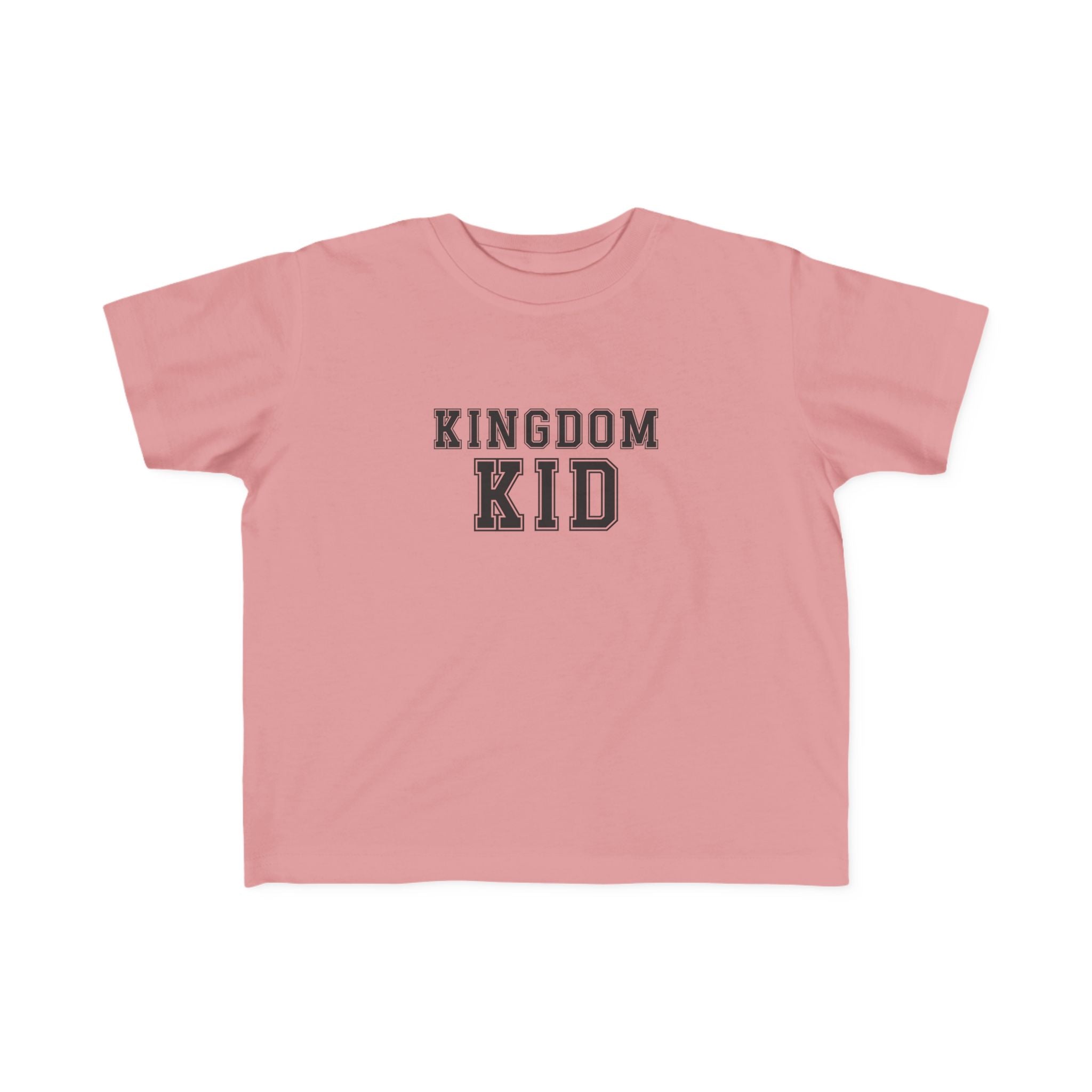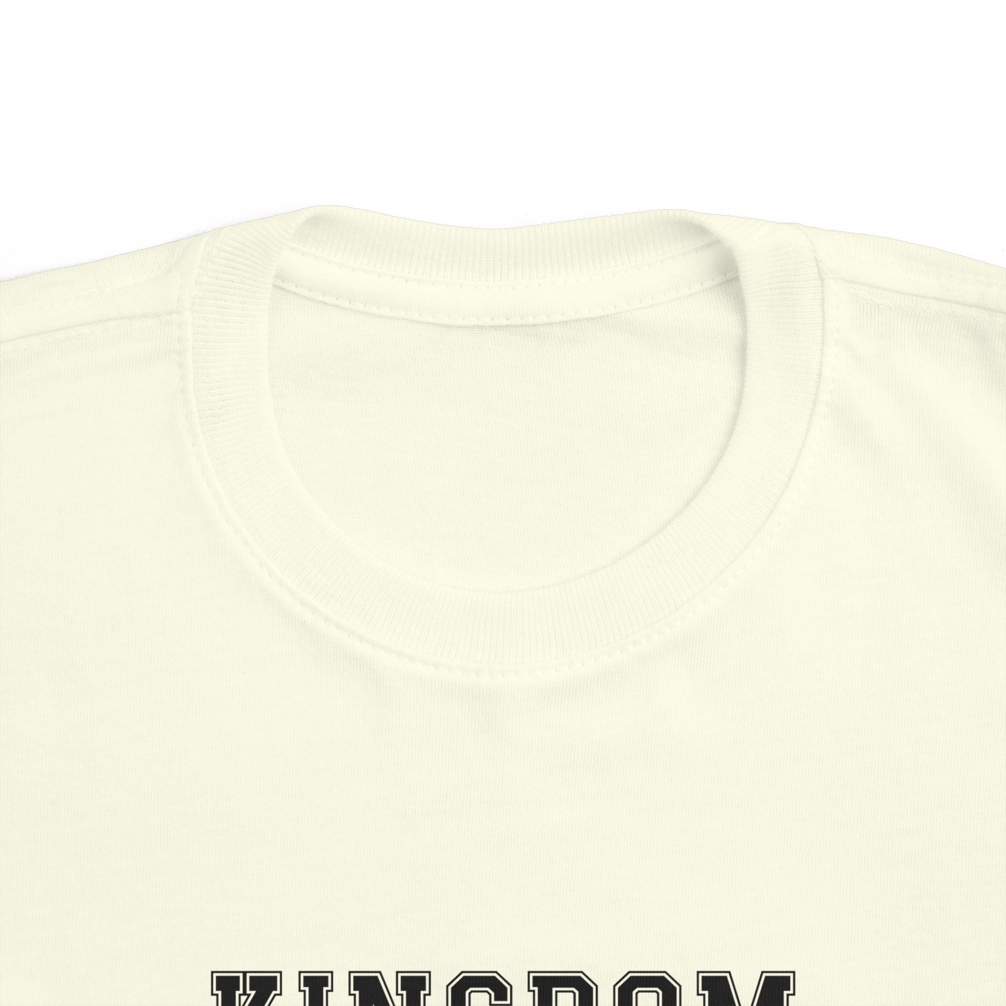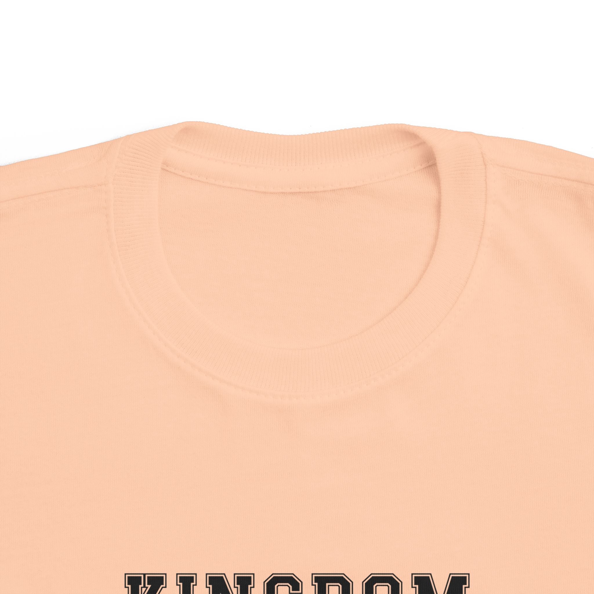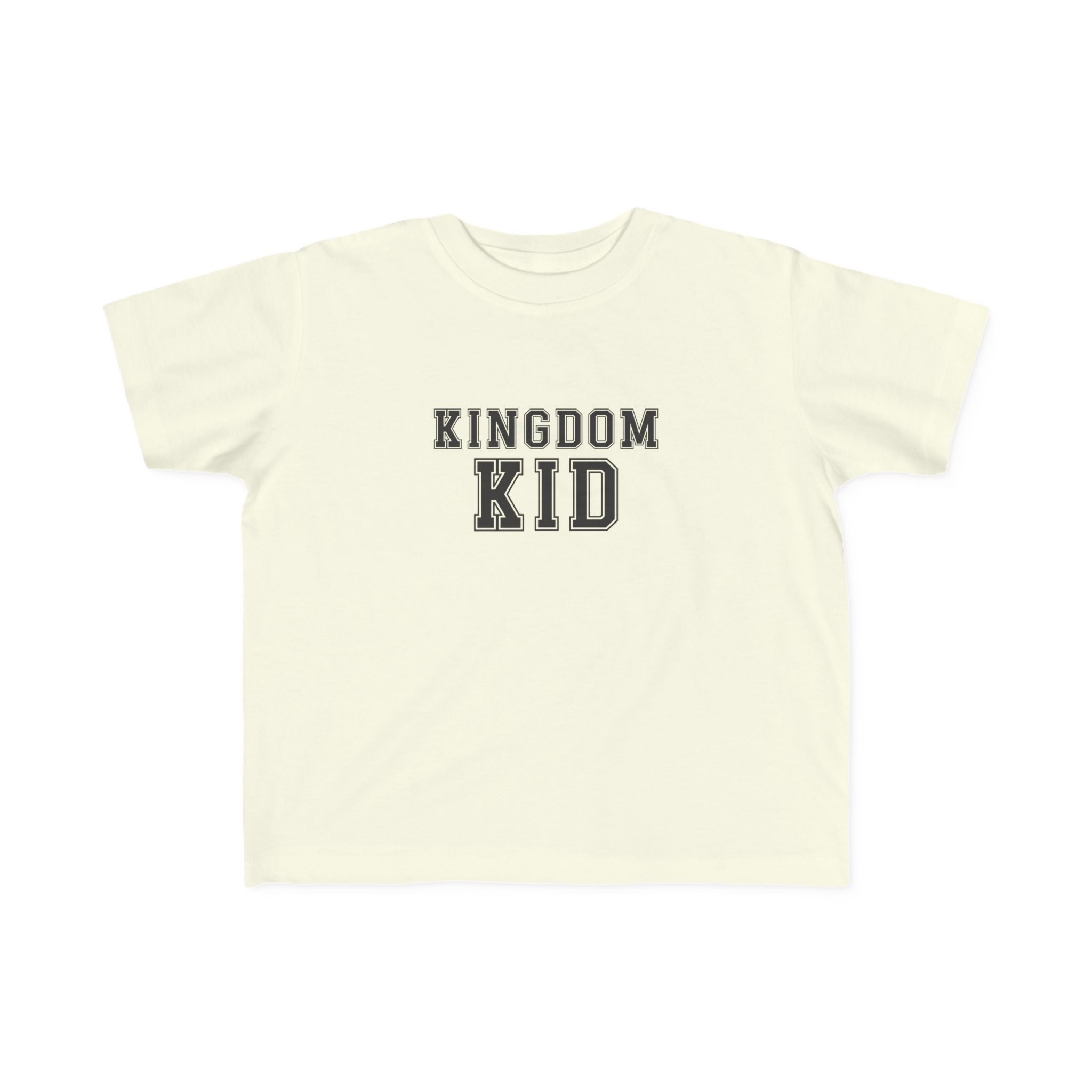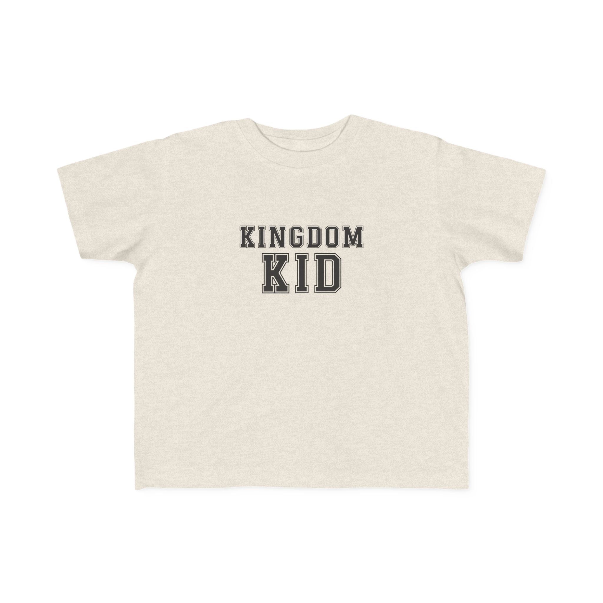 Soft, breathable toddler tee made to move with little ones and wear well over time. The lightweight cotton knit feels gentle on sensitive skin while the ribbed collar and shoulder tape keep the neckline and shape steady through washes and play. A classic, straight cut gives room for wiggles without looking oversized. The subtle collegiate-style lettering reads “Kingdom Kid,” lending quiet confidence and a sweet, faith-forward message that pairs easily with jeans, leggings, or layering under a hoodie for cooler days. Sized to run true to fit and finished with a tear-away label for extra comfort.