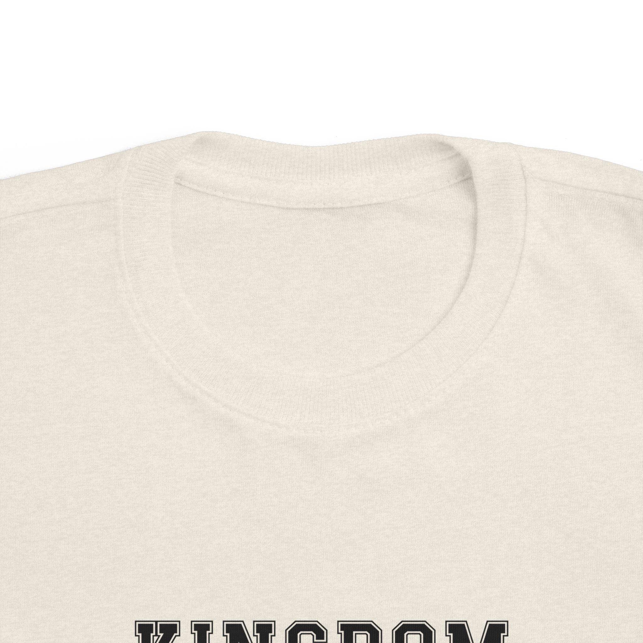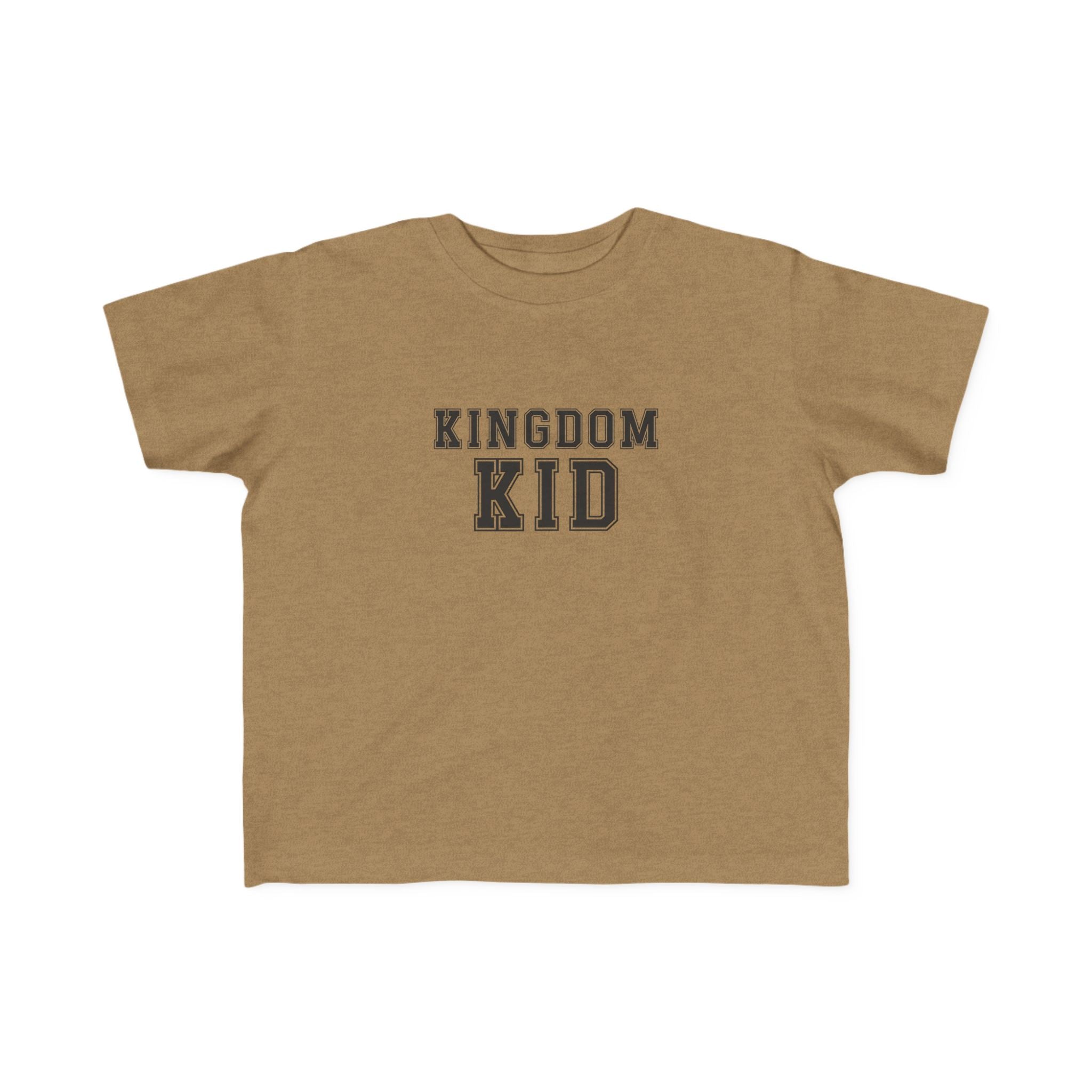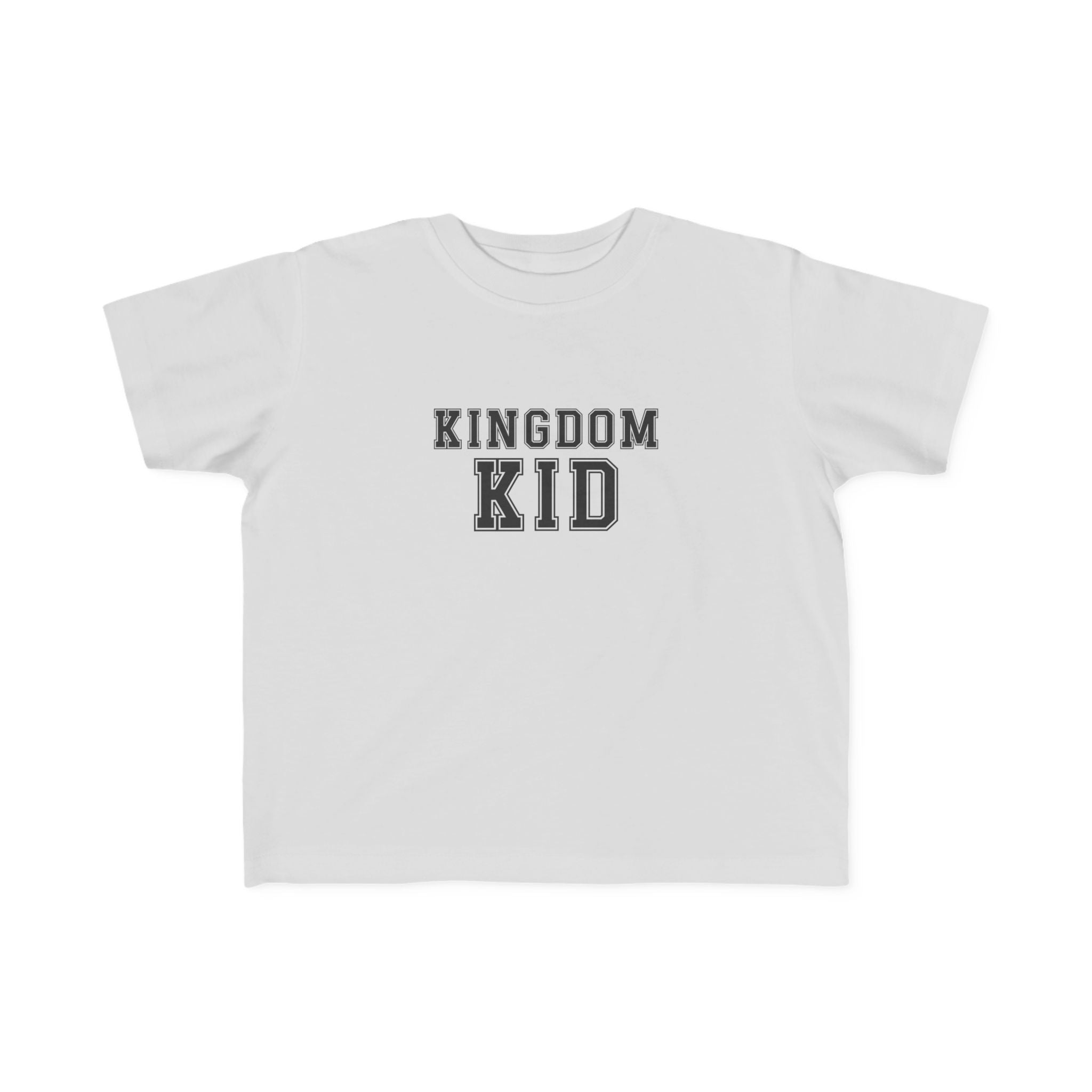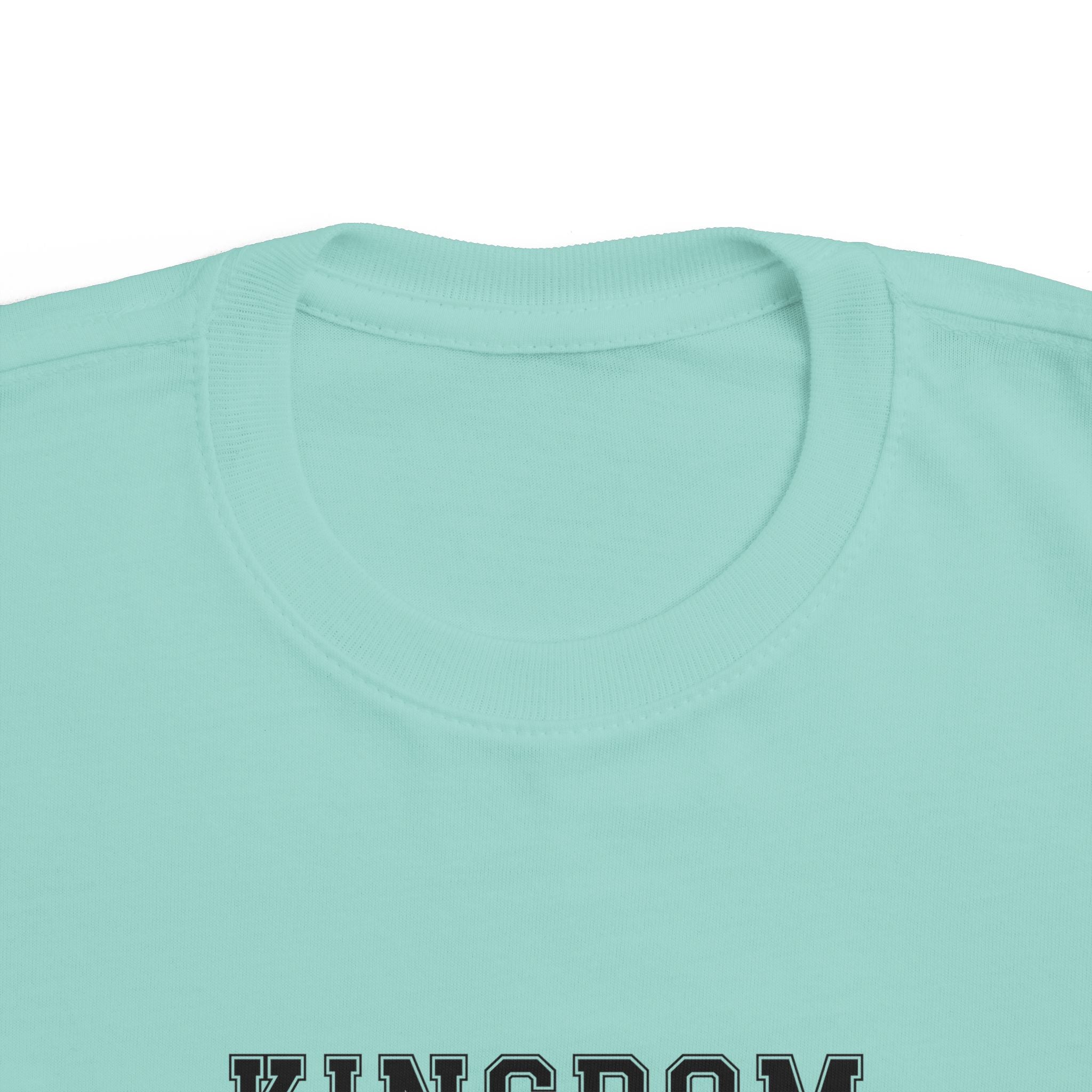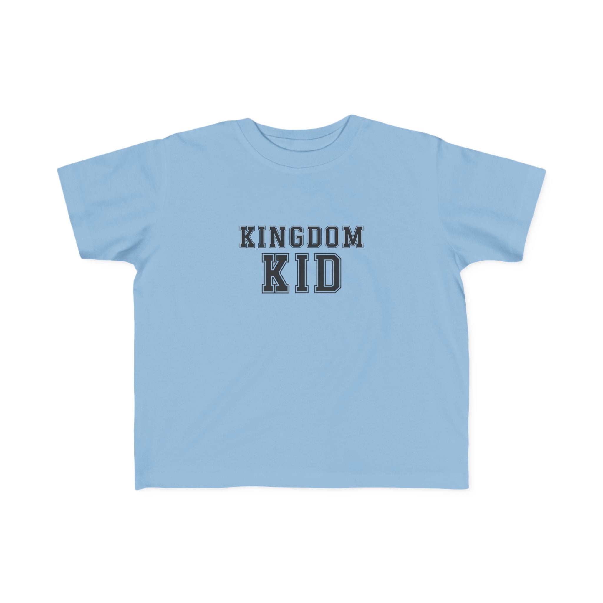 Soft, breathable toddler tee made to move with little ones and wear well over time. The lightweight cotton knit feels gentle on sensitive skin while the ribbed collar and shoulder tape keep the neckline and shape steady through washes and play. A classic, straight cut gives room for wiggles without looking oversized. The subtle collegiate-style lettering reads “Kingdom Kid,” lending quiet confidence and a sweet, faith-forward message that pairs easily with jeans, leggings, or layering under a hoodie for cooler days. Sized to run true to fit and finished with a tear-away label for extra comfort.