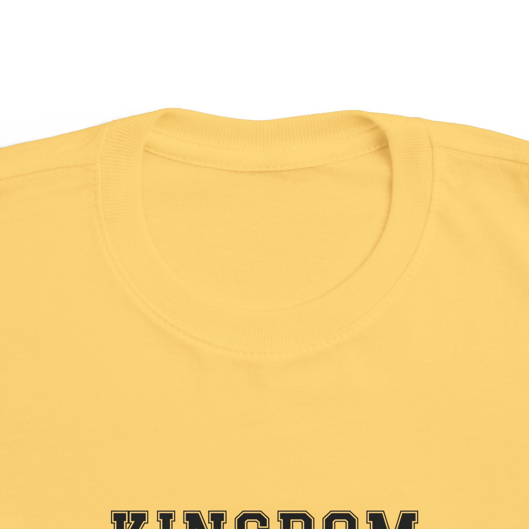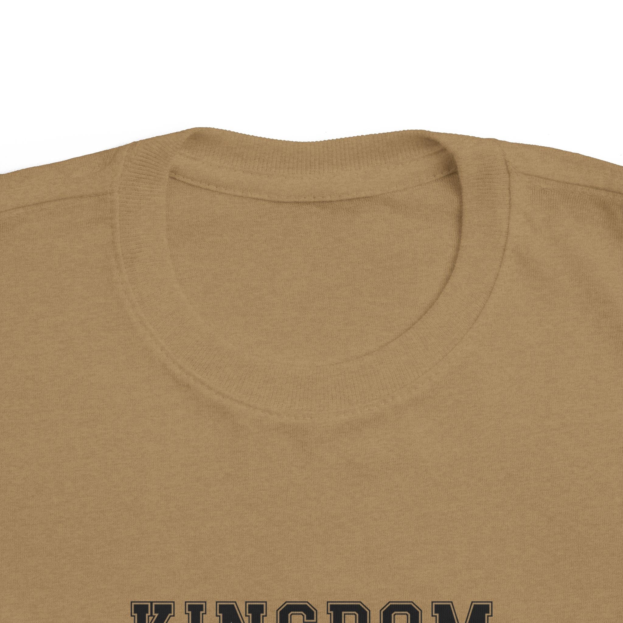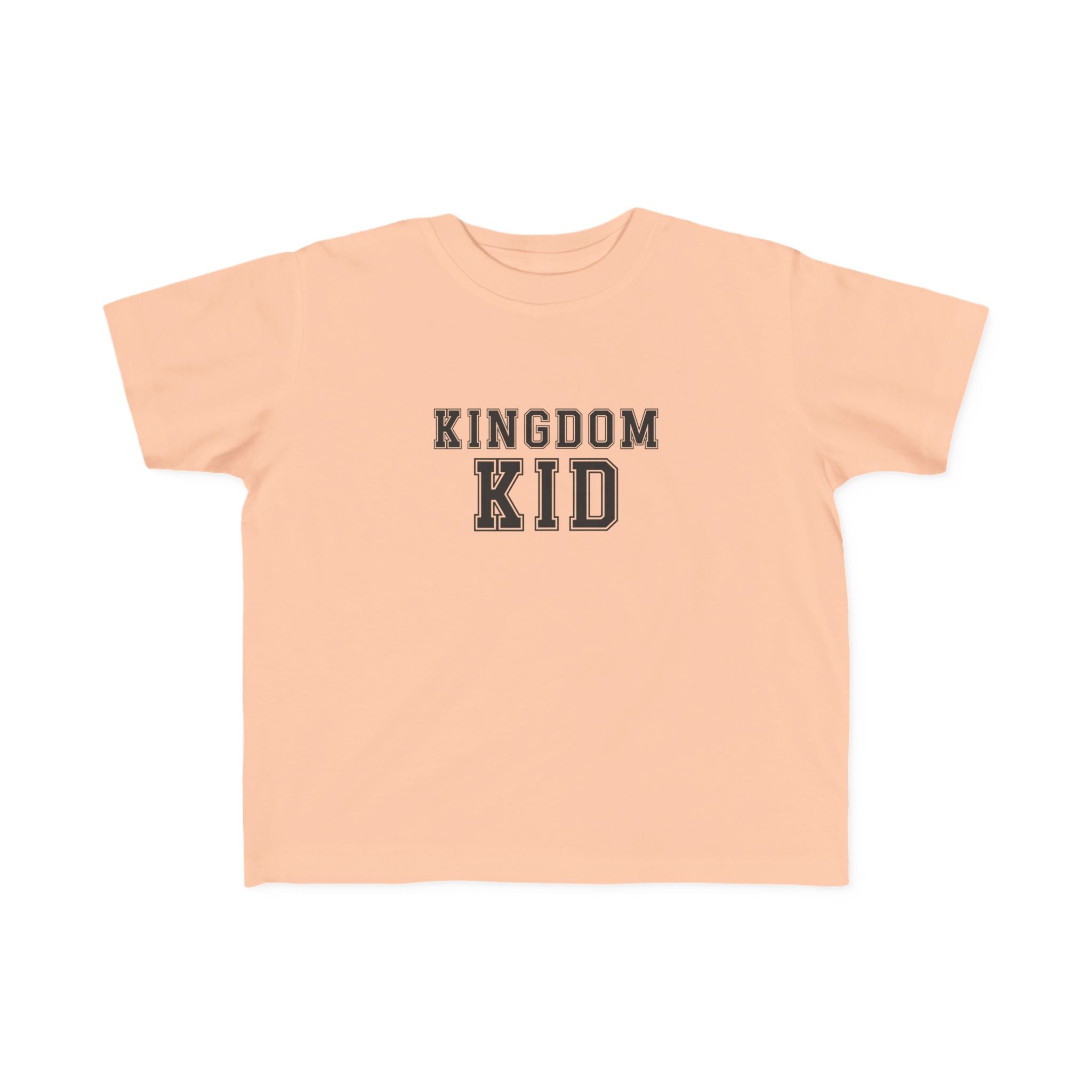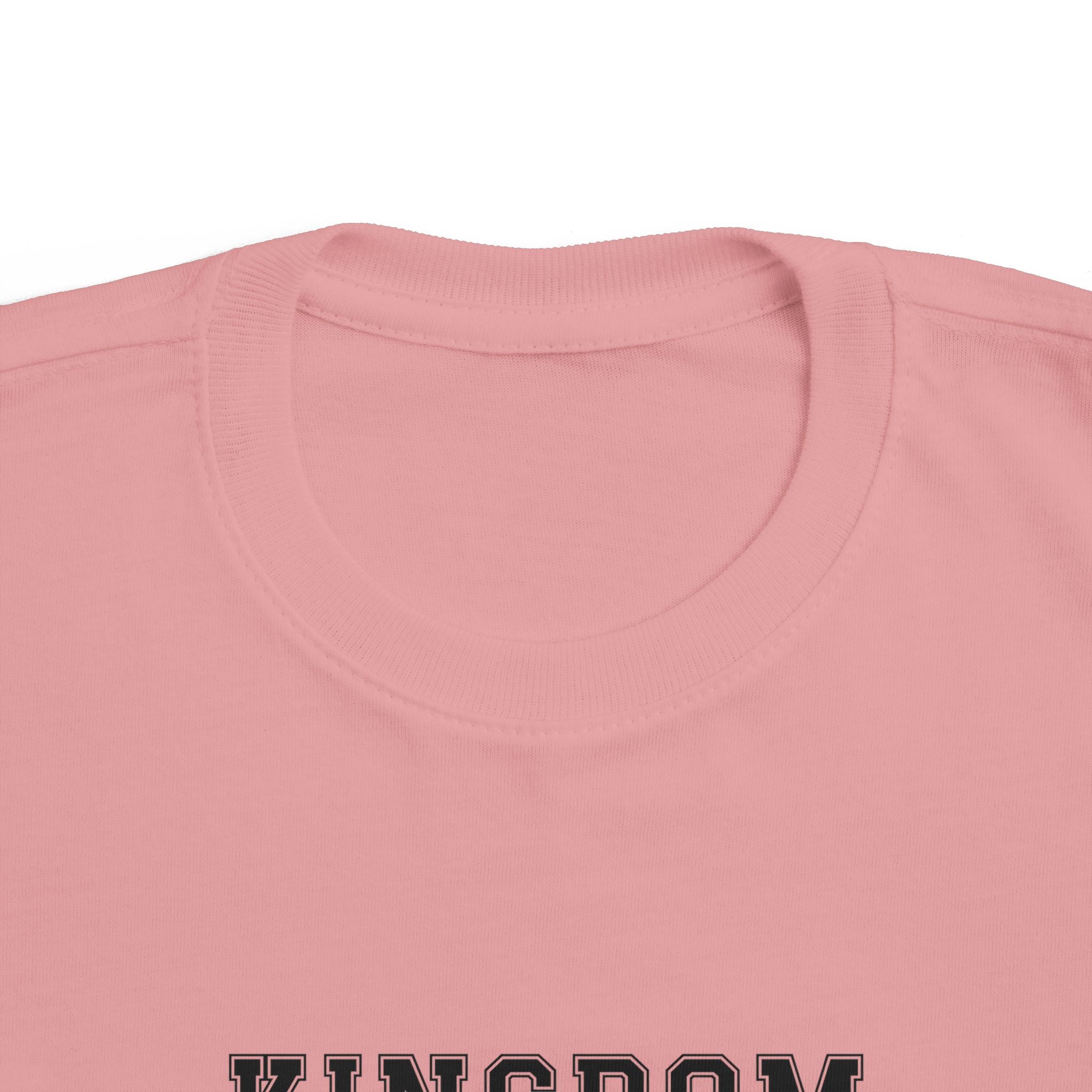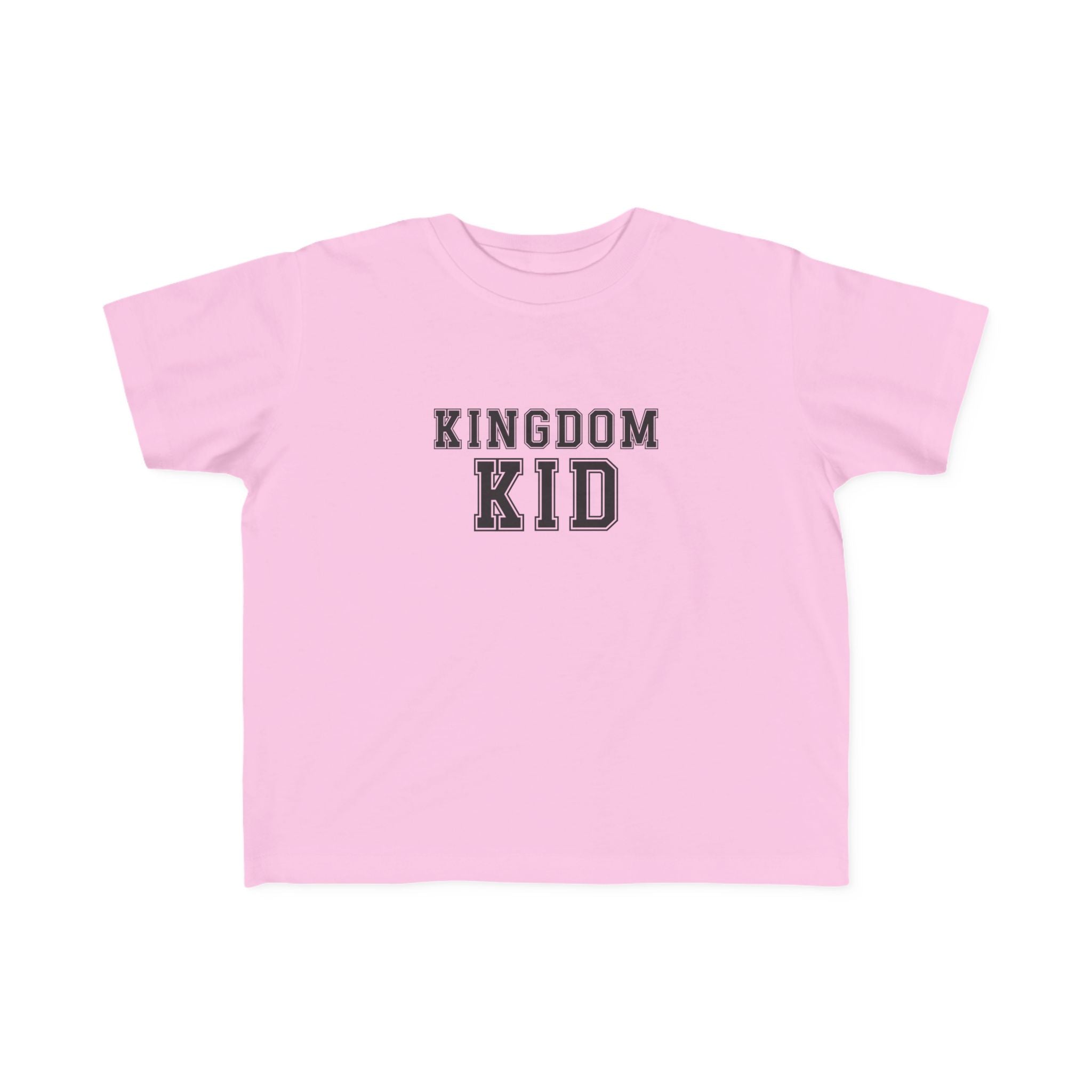 Soft, breathable toddler tee made to move with little ones and wear well over time. The lightweight cotton knit feels gentle on sensitive skin while the ribbed collar and shoulder tape keep the neckline and shape steady through washes and play. A classic, straight cut gives room for wiggles without looking oversized. The subtle collegiate-style lettering reads “Kingdom Kid,” lending quiet confidence and a sweet, faith-forward message that pairs easily with jeans, leggings, or layering under a hoodie for cooler days. Sized to run true to fit and finished with a tear-away label for extra comfort.