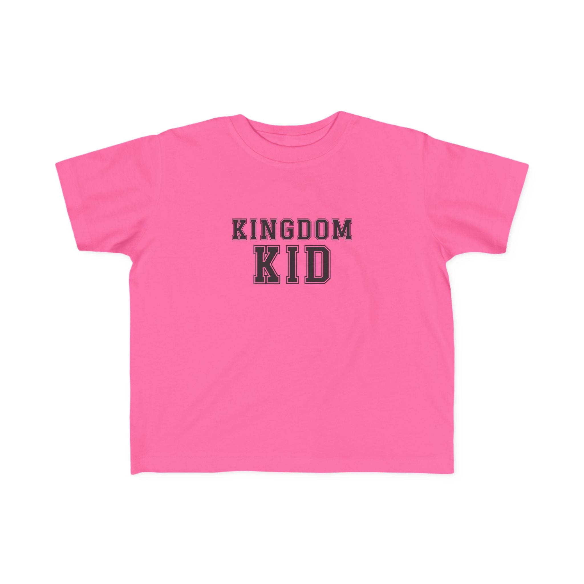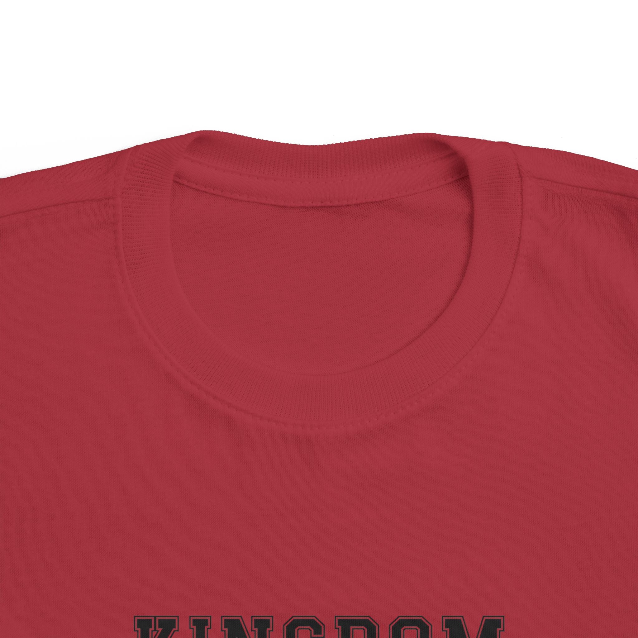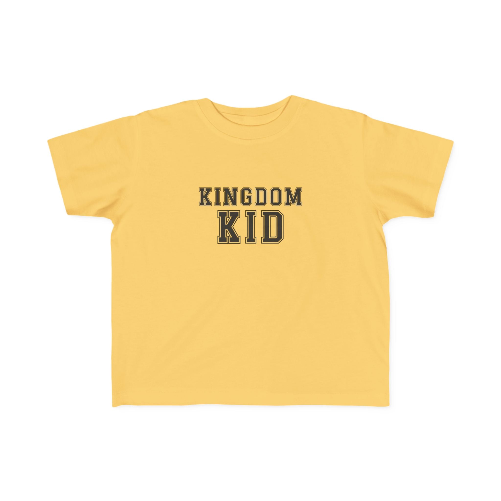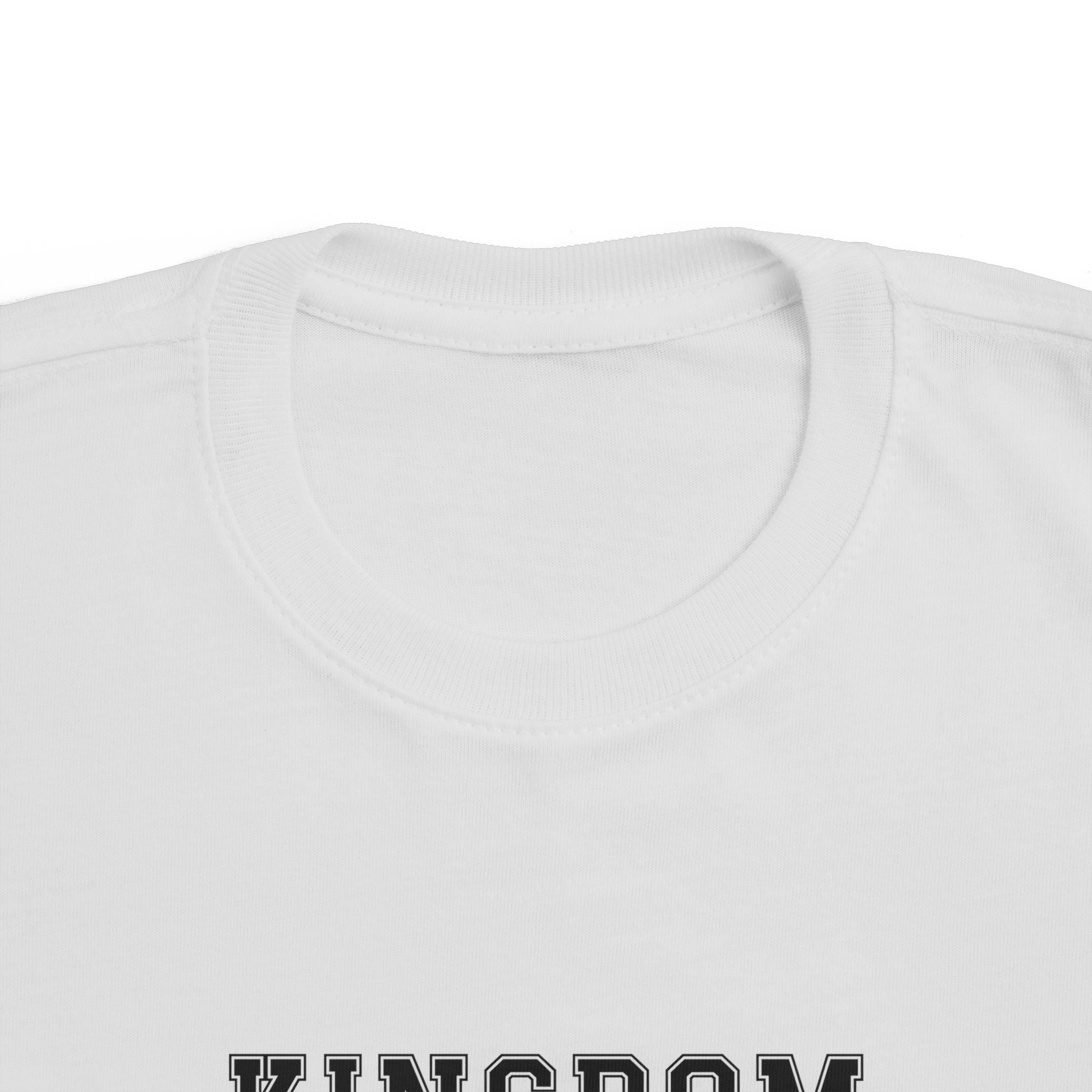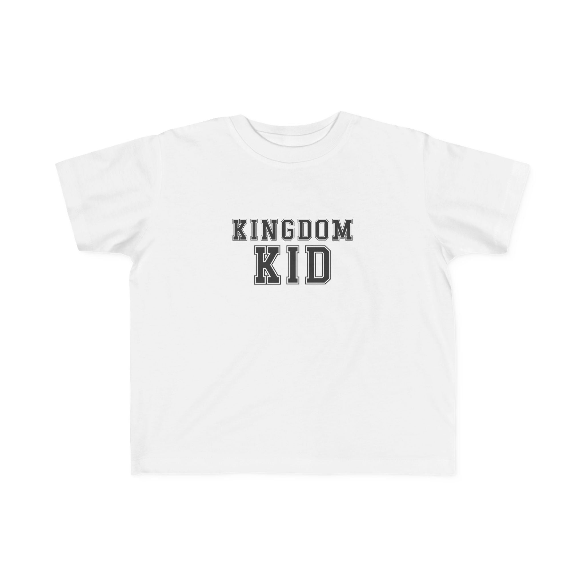 Soft, breathable toddler tee made to move with little ones and wear well over time. The lightweight cotton knit feels gentle on sensitive skin while the ribbed collar and shoulder tape keep the neckline and shape steady through washes and play. A classic, straight cut gives room for wiggles without looking oversized. The subtle collegiate-style lettering reads “Kingdom Kid,” lending quiet confidence and a sweet, faith-forward message that pairs easily with jeans, leggings, or layering under a hoodie for cooler days. Sized to run true to fit and finished with a tear-away label for extra comfort.