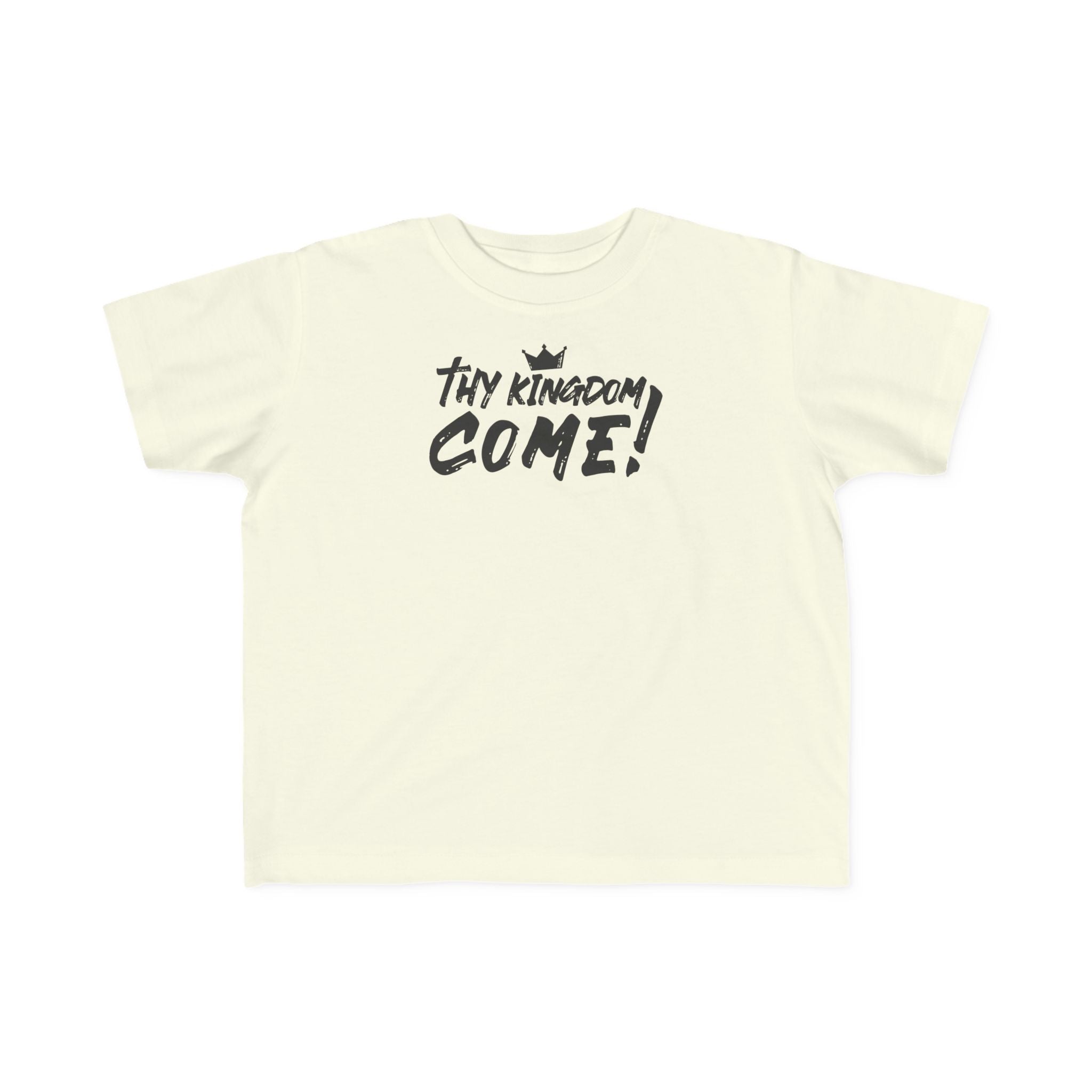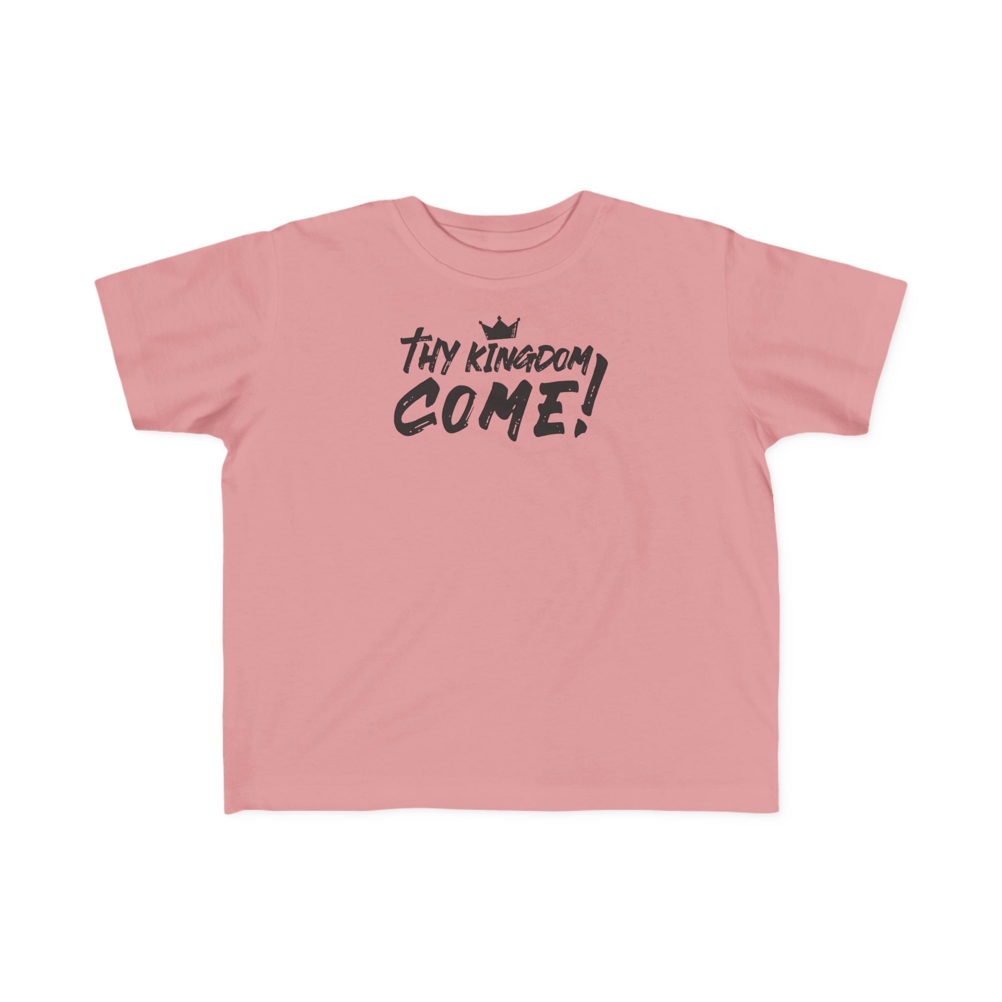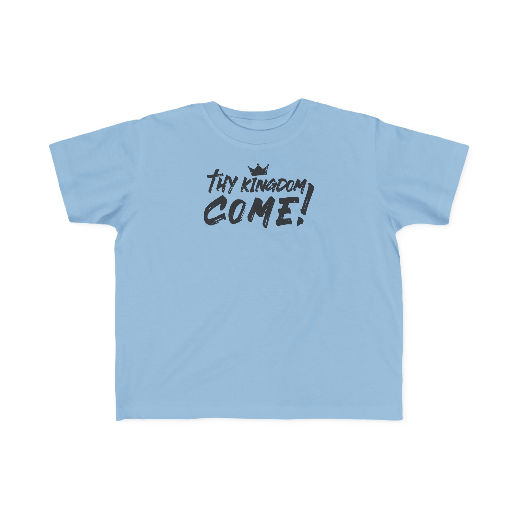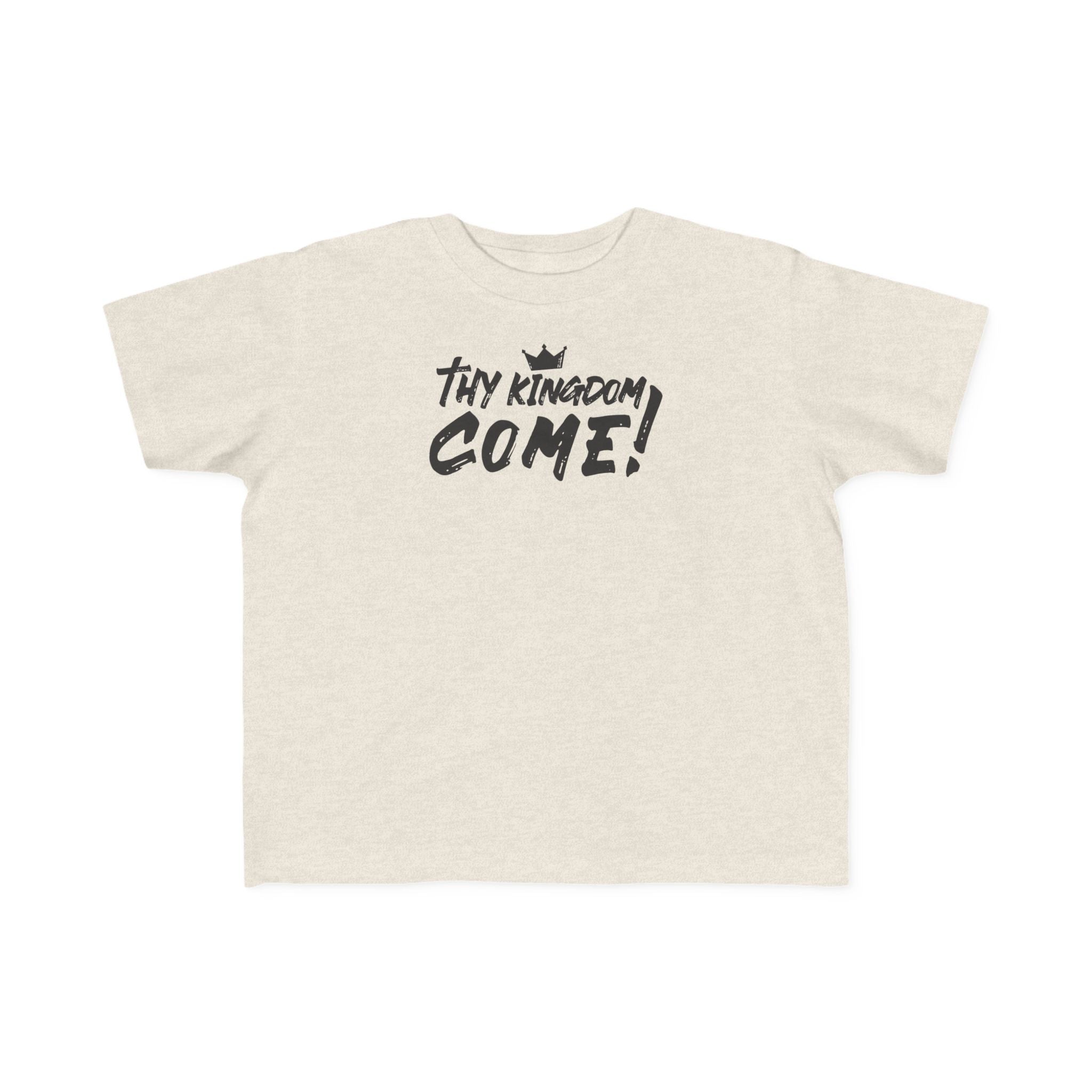 Soft, breathable tee made for tiny hands and big imaginations. The lightweight cotton keeps little ones comfortable during playtime and naps, while the joyful hand-lettered “Tiny Kingdom COME!” art adds a playful, spirited touch. It sits with a classic fit and clean lines so it layers easily under jackets or stands out on its own. Built with careful details — ribbed collar, shoulder tape and side seams — it stays shaped after washes and tumbles. A tear-away label and true-to-size cut make dressing fuss-free for busy mornings and family outings.