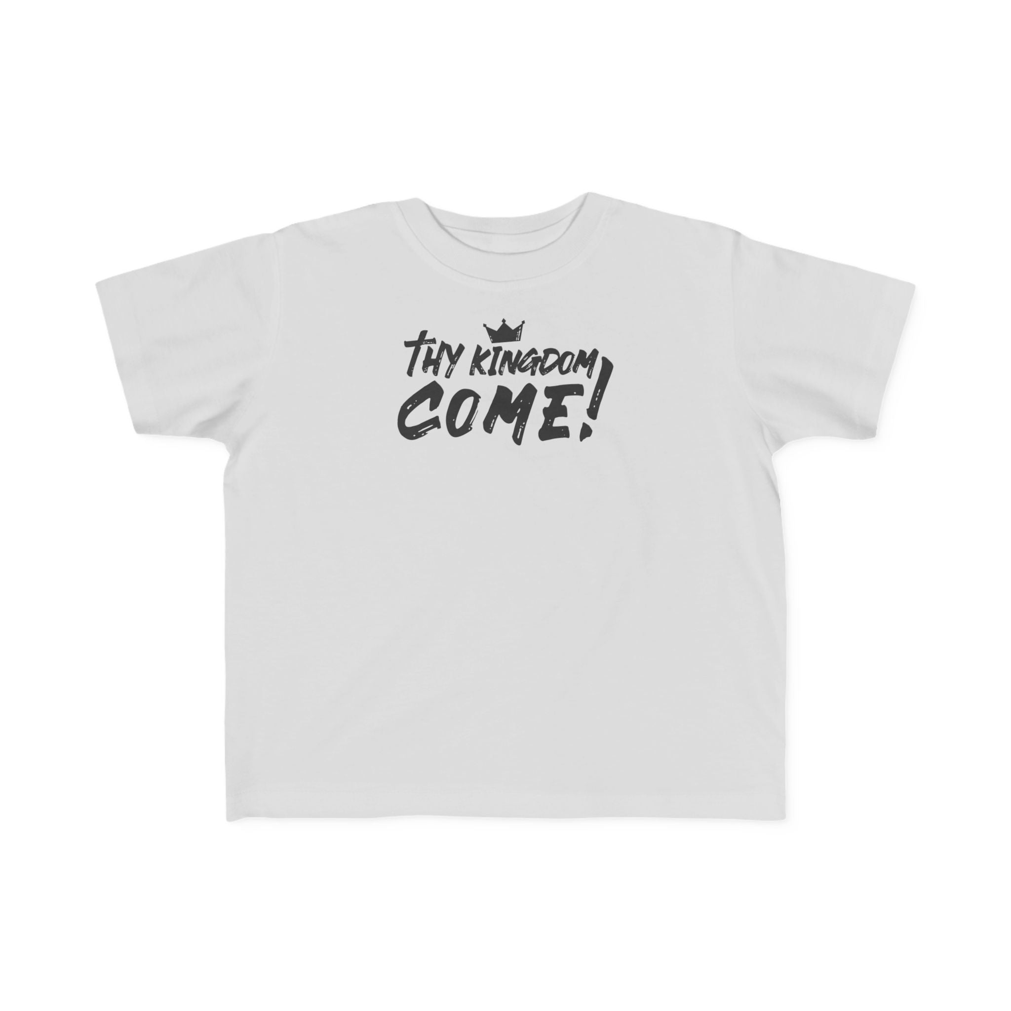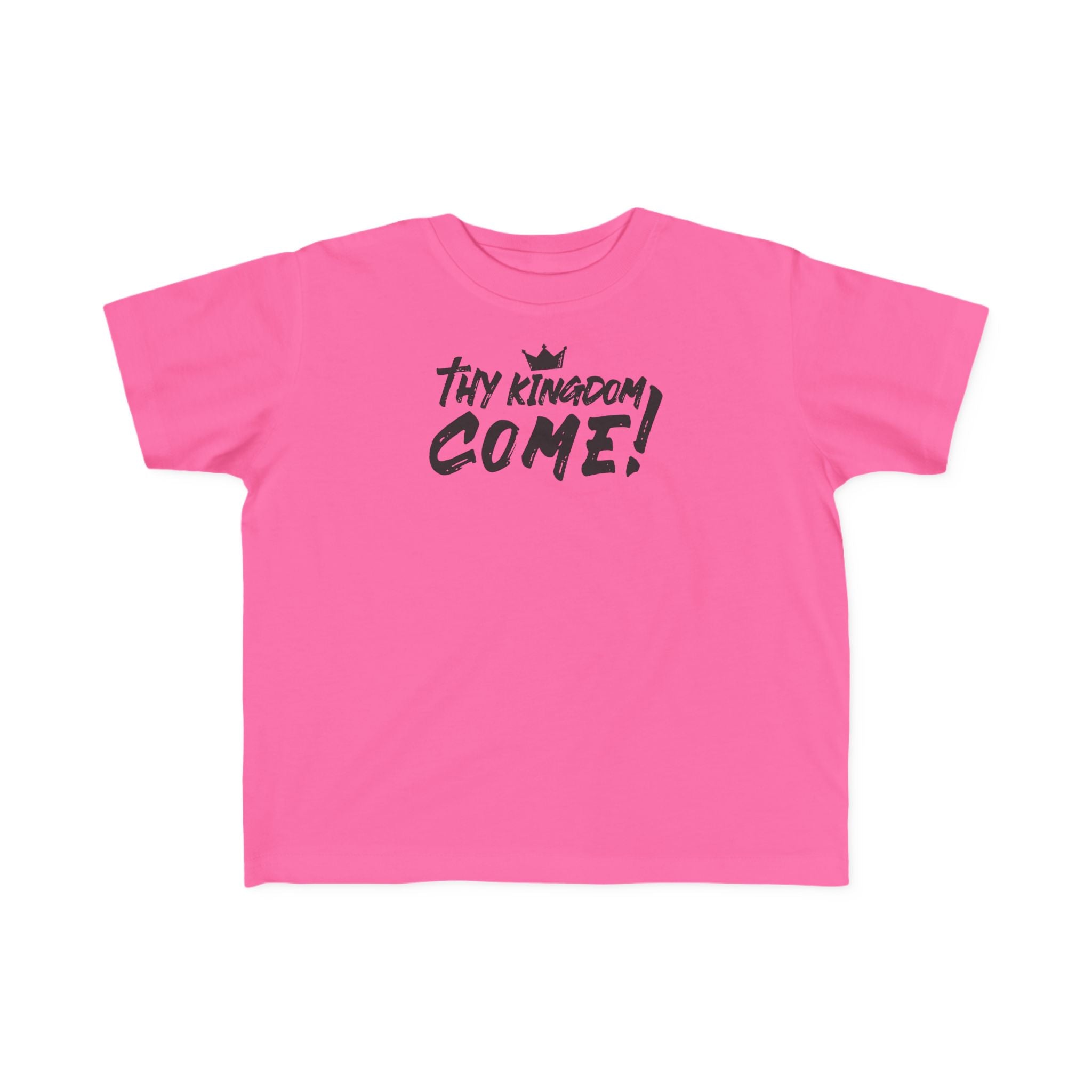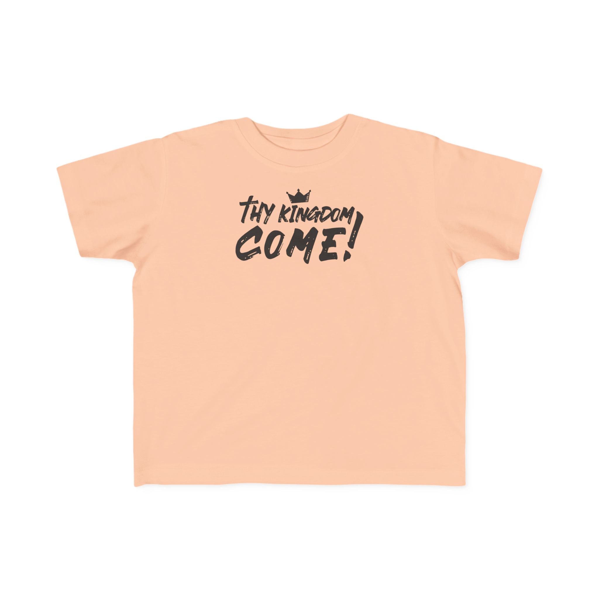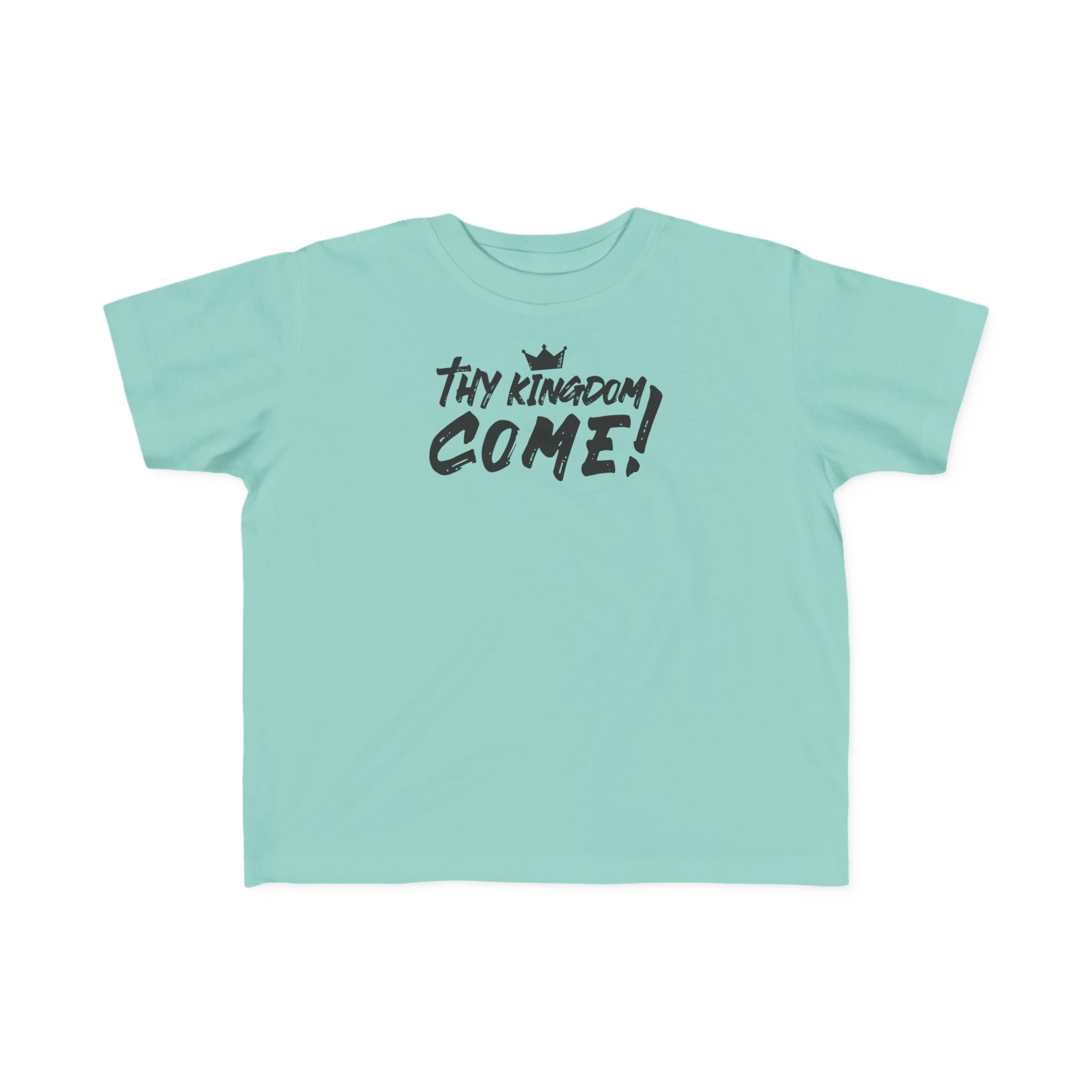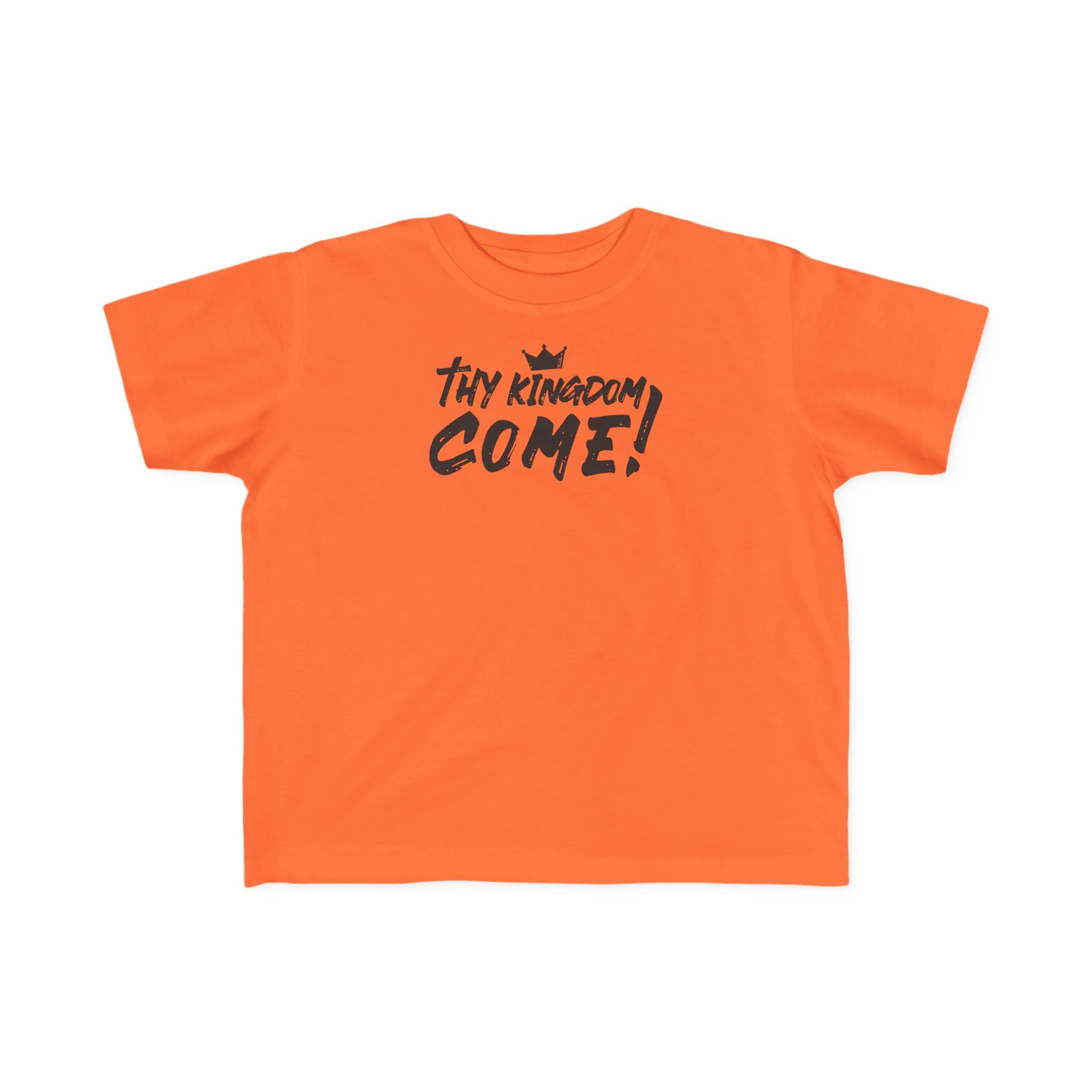 Soft, breathable tee made for tiny hands and big imaginations. The lightweight cotton keeps little ones comfortable during playtime and naps, while the joyful hand-lettered “Tiny Kingdom COME!” art adds a playful, spirited touch. It sits with a classic fit and clean lines so it layers easily under jackets or stands out on its own. Built with careful details — ribbed collar, shoulder tape and side seams — it stays shaped after washes and tumbles. A tear-away label and true-to-size cut make dressing fuss-free for busy mornings and family outings.